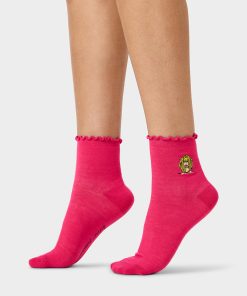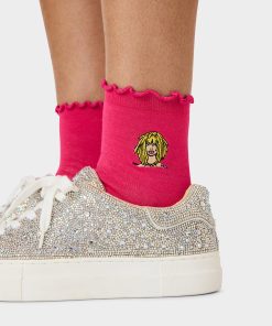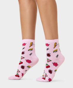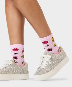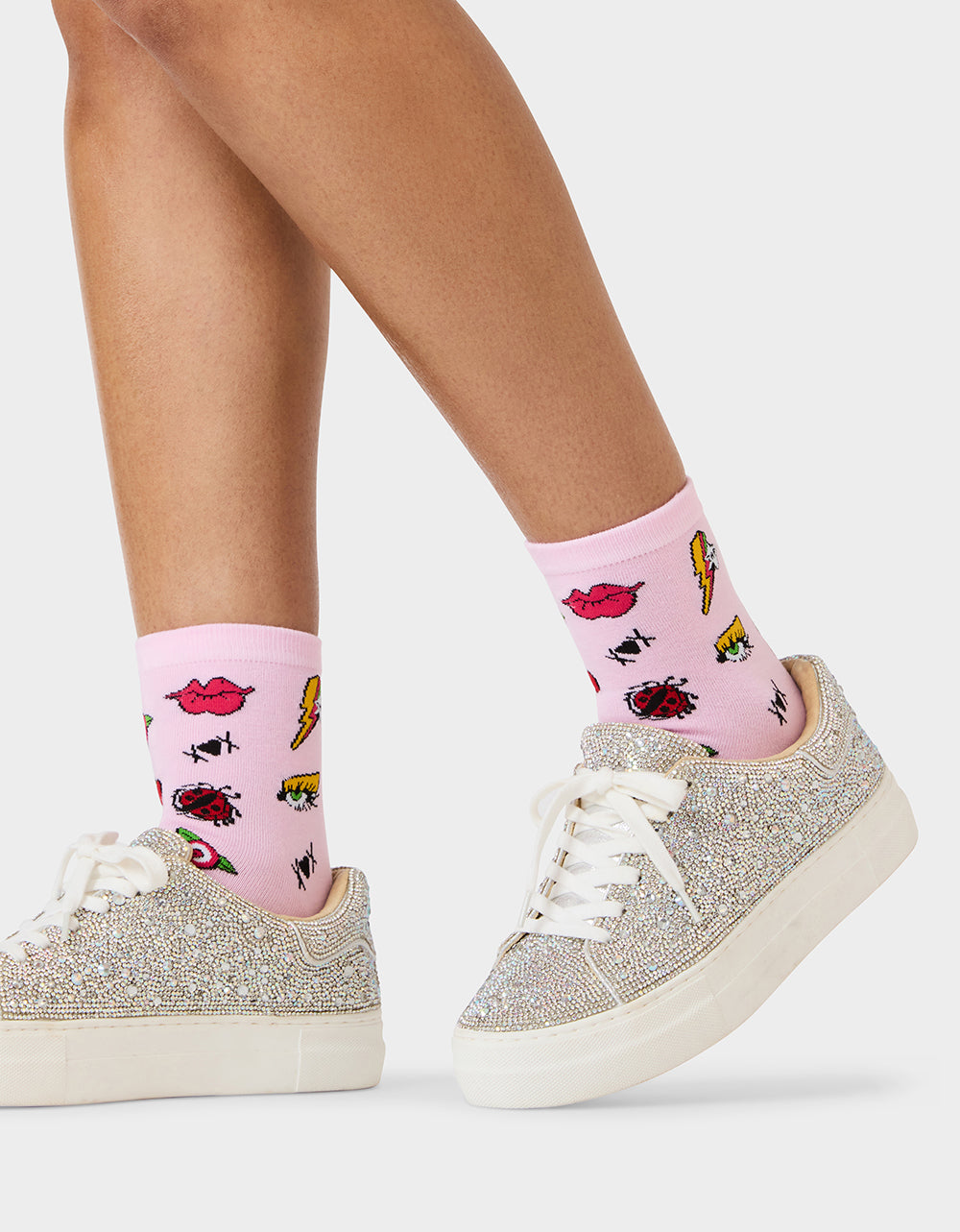 Step into playful style with our fun 2-PACK EMBROIDERED CREW SOCK PINK MULTI set. One pair features Betsey’s iconic portrait embroidered in hot pink. while the other showcases a vibrant mix of cherries. lightning bolts. ladybugs. lips. and roses. Mix and match these bold designs to express your personality and add a whimsical touch to any outfit. Perfect for Betsey Johnson fans who love bold. statement-making accessories.