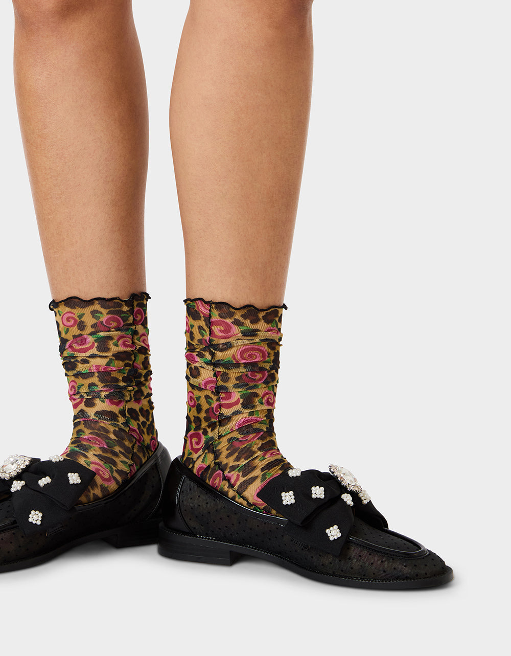2-PACK LEOPARD ROSE MESH CREW SOCKS TAN MULTI