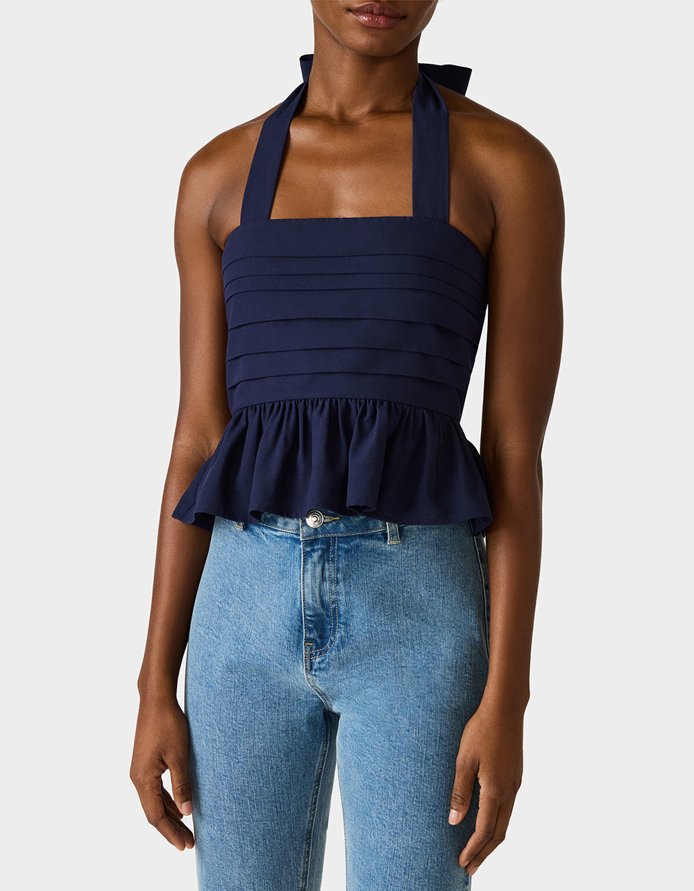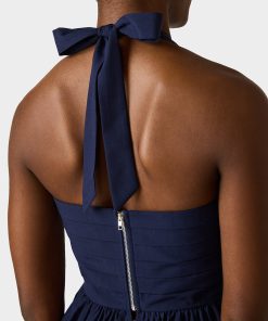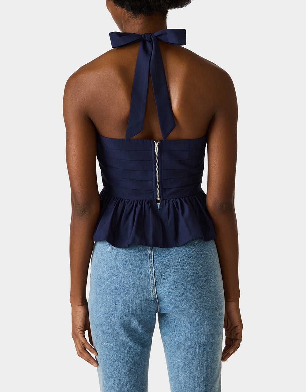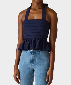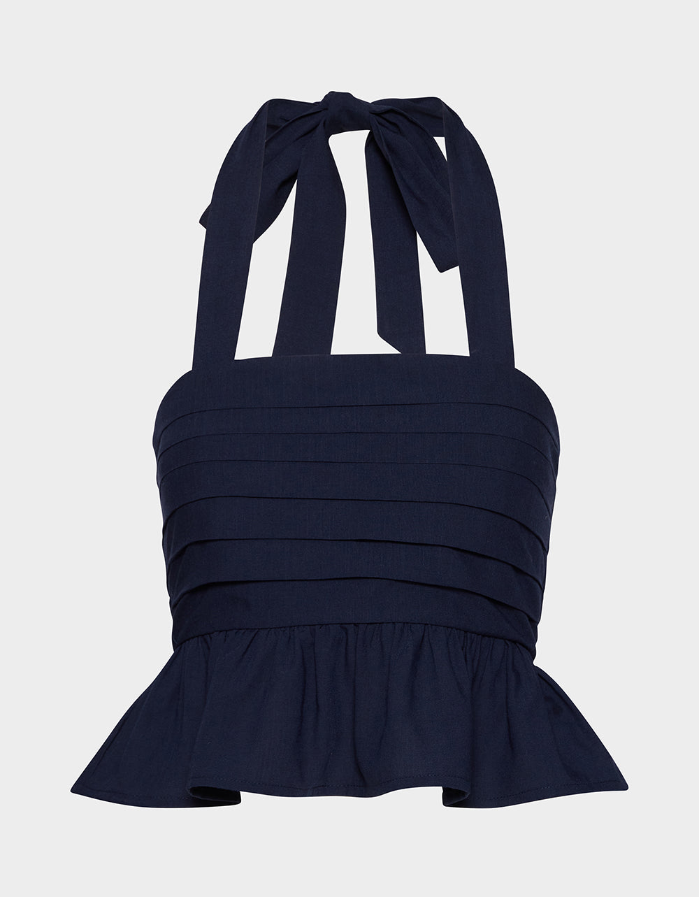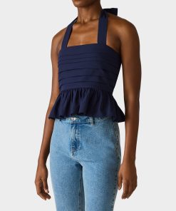 Make a statement in this playful AHOY PEPLUM NAVY featuring a chic square neckline and flattering halter tie design. The back zipper closure ensures an easy fit. while the structured peplum hem adds a fun. feminine silhouette. Perfect for dressing up or down. this navy essential brings bold style to any occasion.