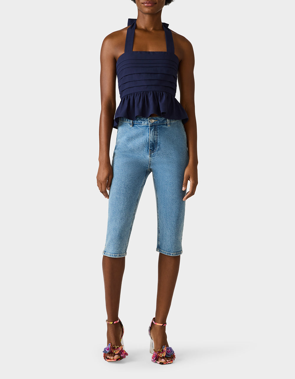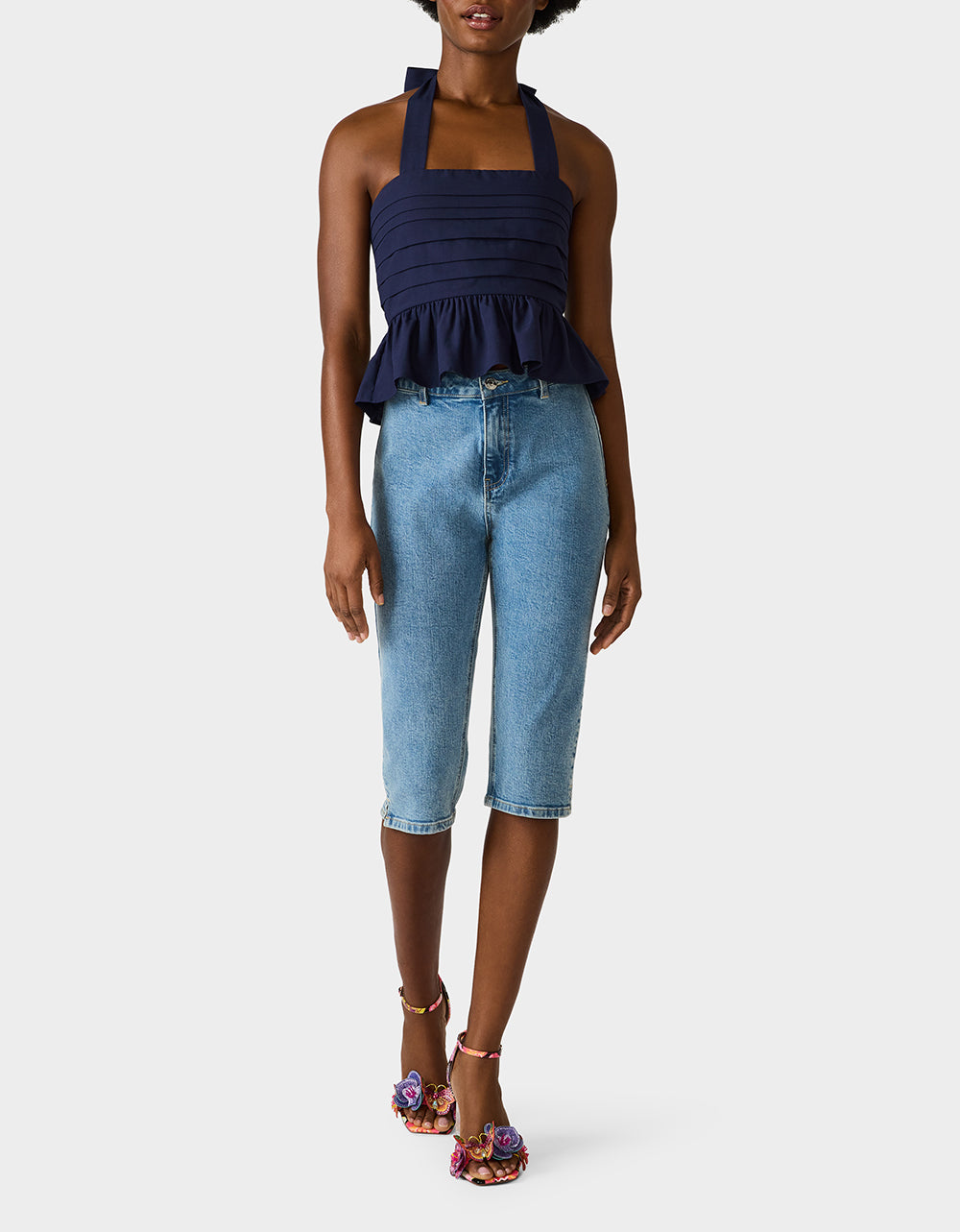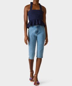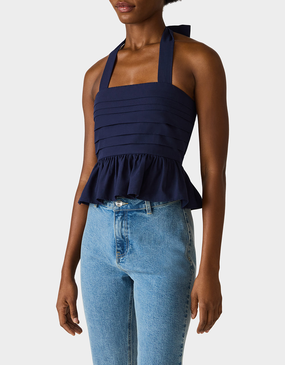 Make a statement in this playful AHOY PEPLUM NAVY featuring a chic square neckline and flattering halter tie design. The back zipper closure ensures an easy fit. while the structured peplum hem adds a fun. feminine silhouette. Perfect for dressing up or down. this navy essential brings bold style to any occasion.