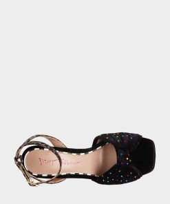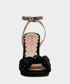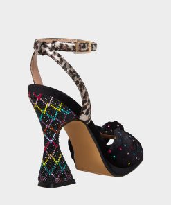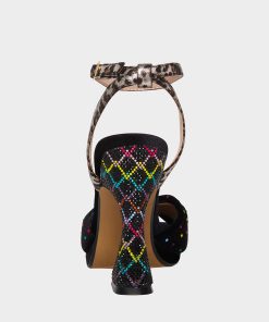 Be jeweled in the Alianna velvet ankle strap dress sandals. It features a leopard print ankle strap with an asymmetric flared heel embellished with rainbow rhinestones.