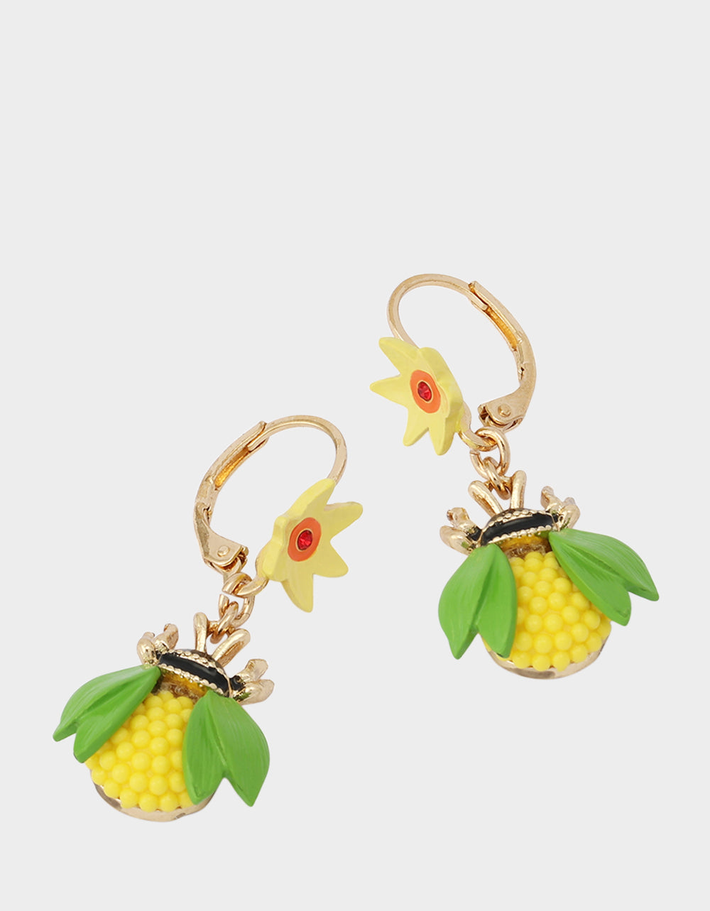 Playful drop featuring whimsical bee paired with small flower charm. Posts are made from hypoallergenic surgical steel perfect for everyday. Earrings have a lever back closure. Made from metal. plastic. glass crystal and surgical steel.