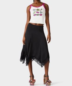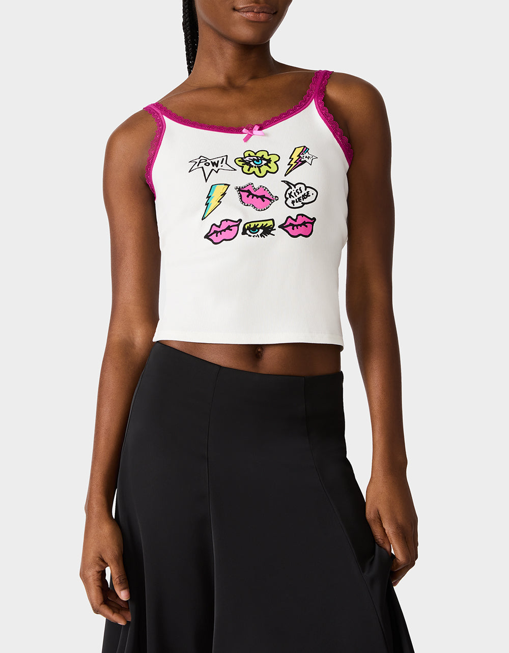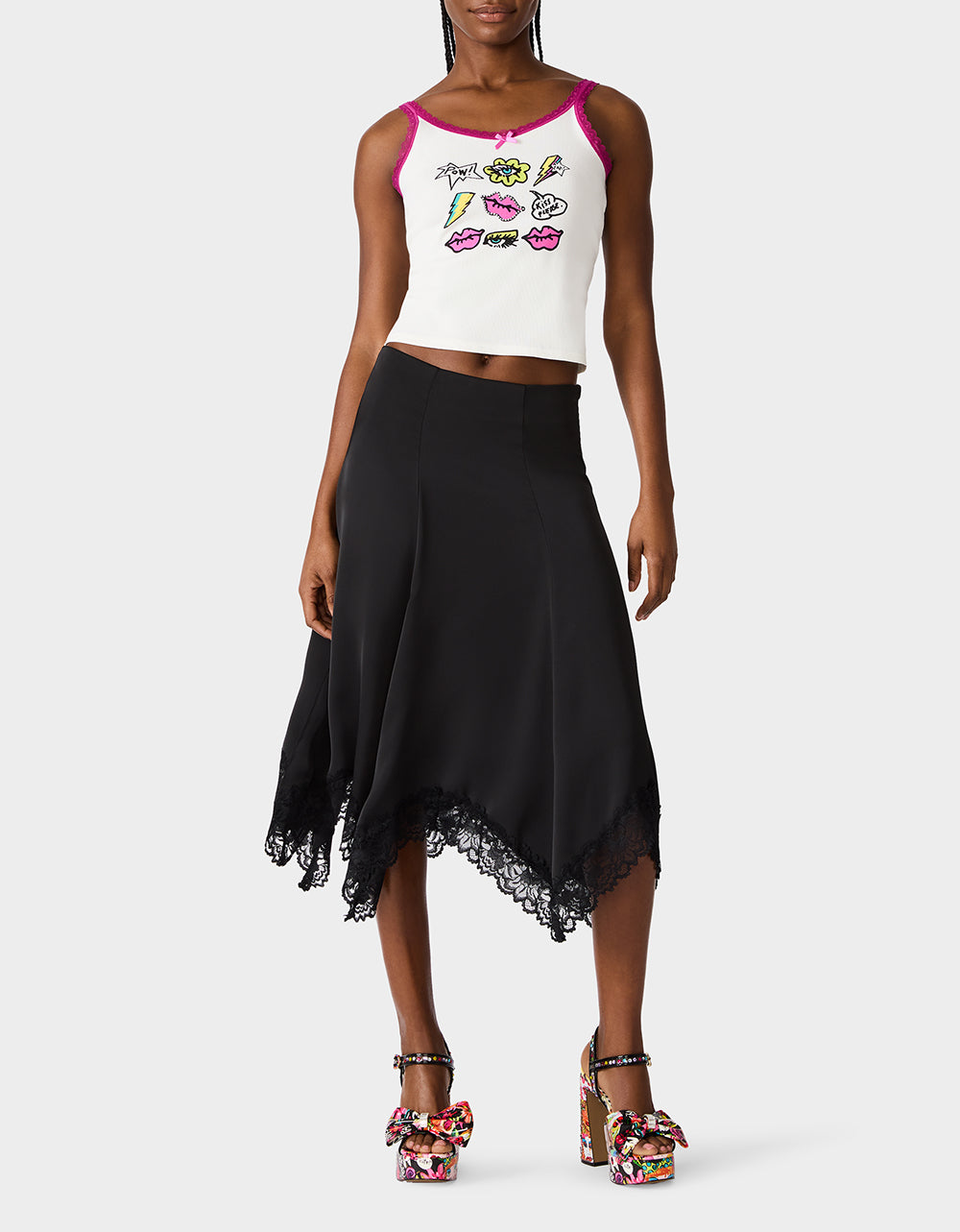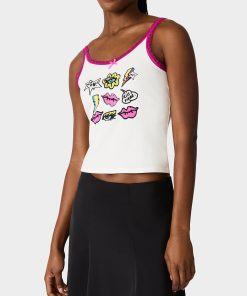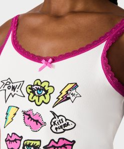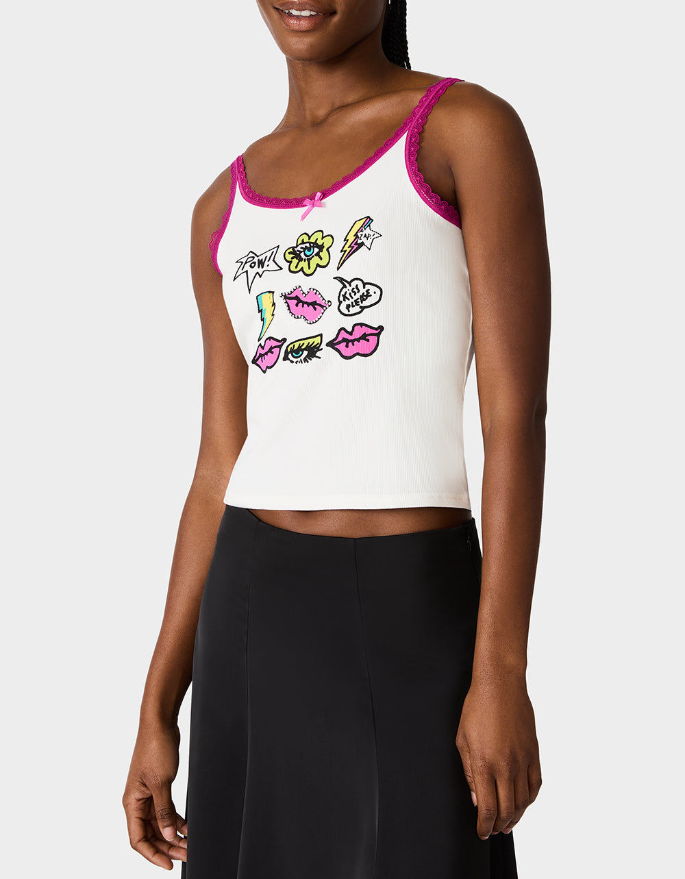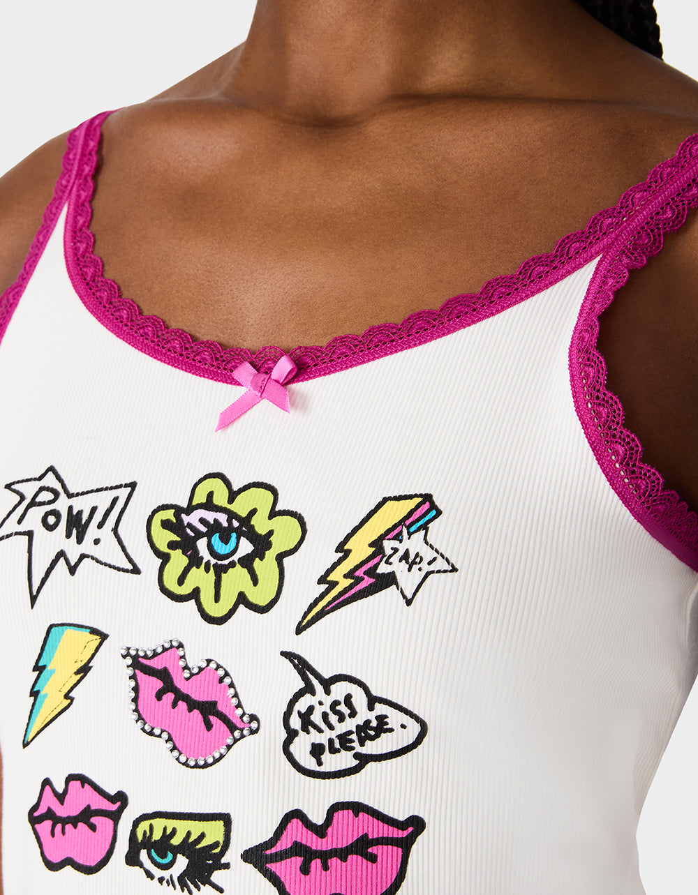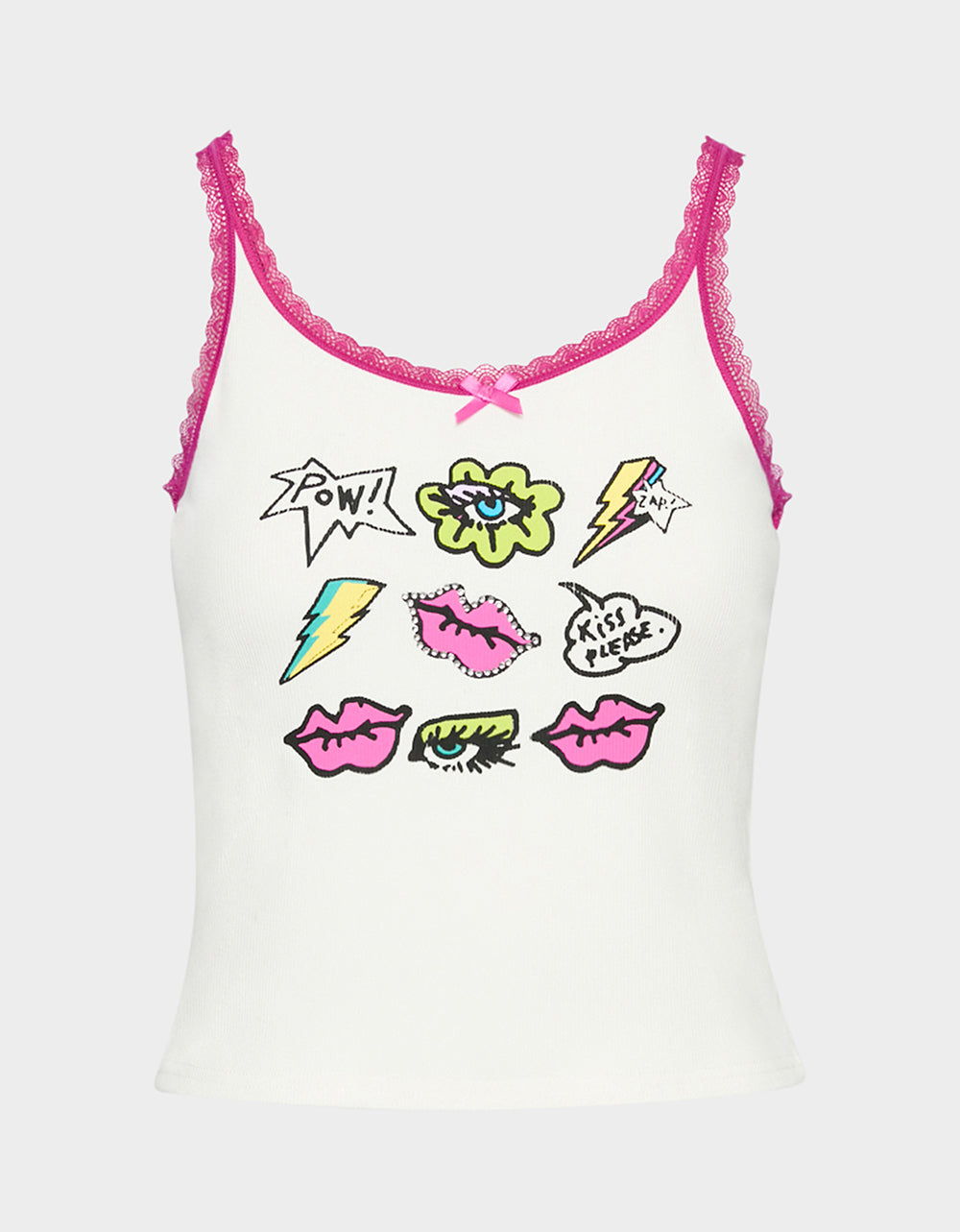 Embrace your bold side with the BETSEY ICON CLUSTER TANK WHITE. part of our art campaign collection. This classic tank features playful lace trim detailing and signature Betsey Johnson graphics—lips. lightning bolts. eyes. and iconic symbols that make a statement. A versatile wardrobe essential that celebrates individuality and artistic expression.