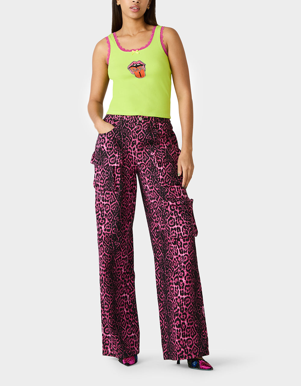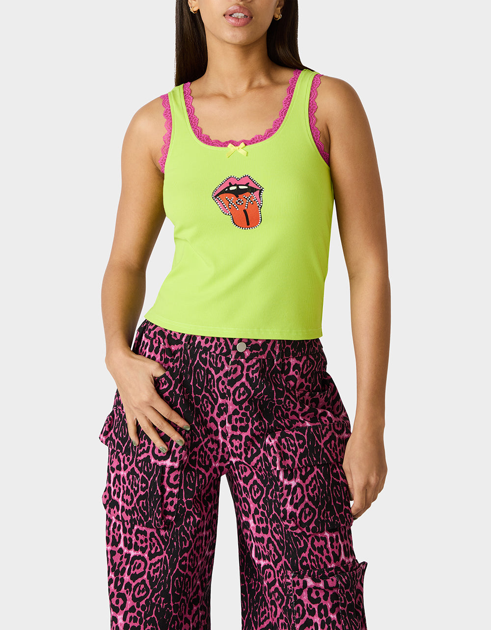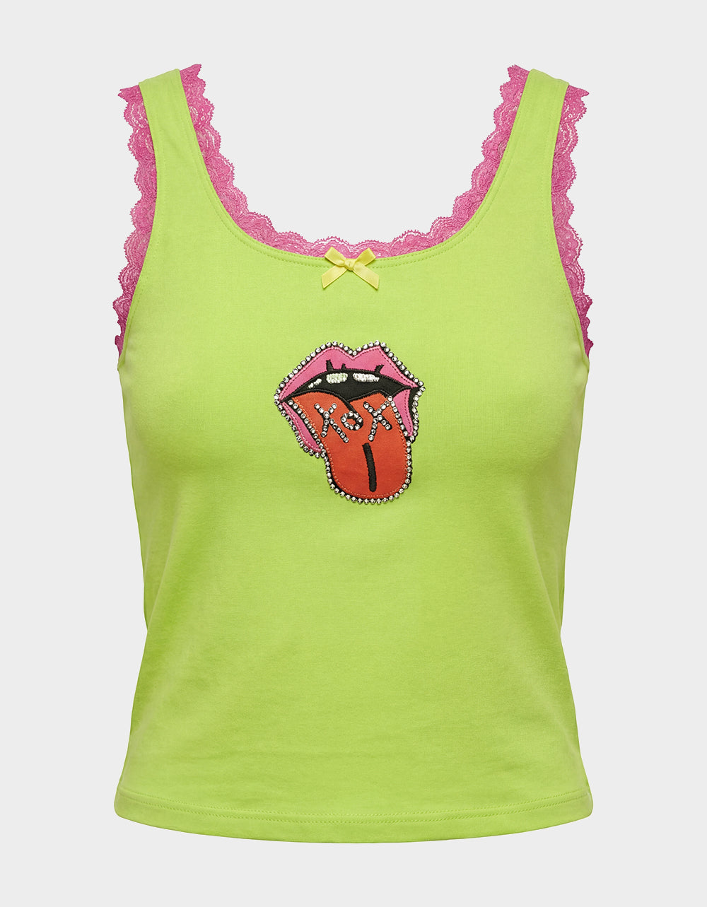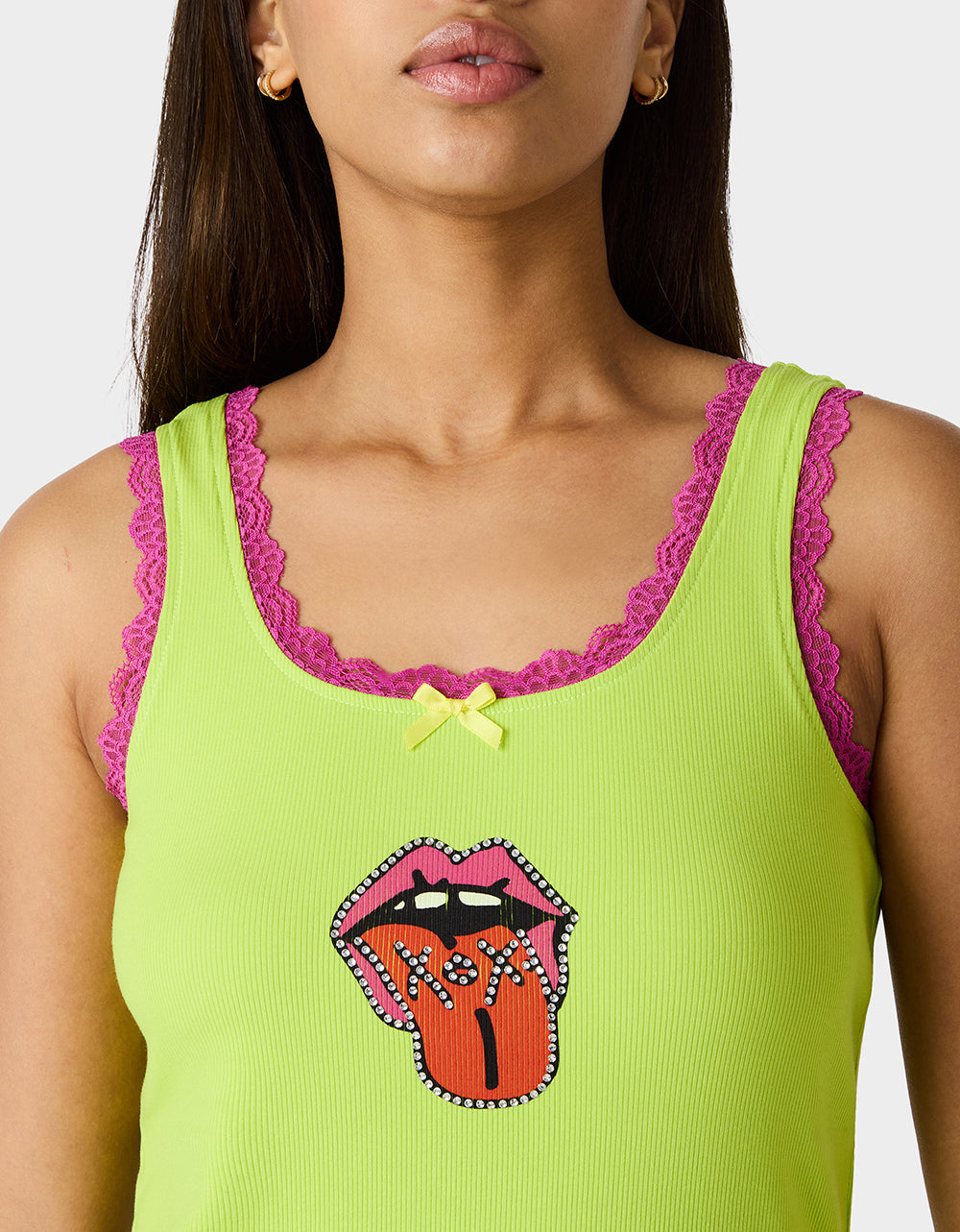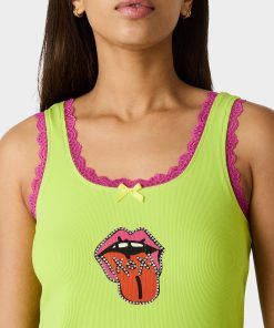 Ignite your style with the BETSEY ICON TANK TOP GREEN. a bold staple from our art campaign collection. This classic green tank features striking pink lace trim detailing and tongue-out graphic that makes a statement. Versatile enough for everyday wear yet distinctive enough to stand out. it’s the perfect piece to express your fearless spirit and add edge to any outfit.