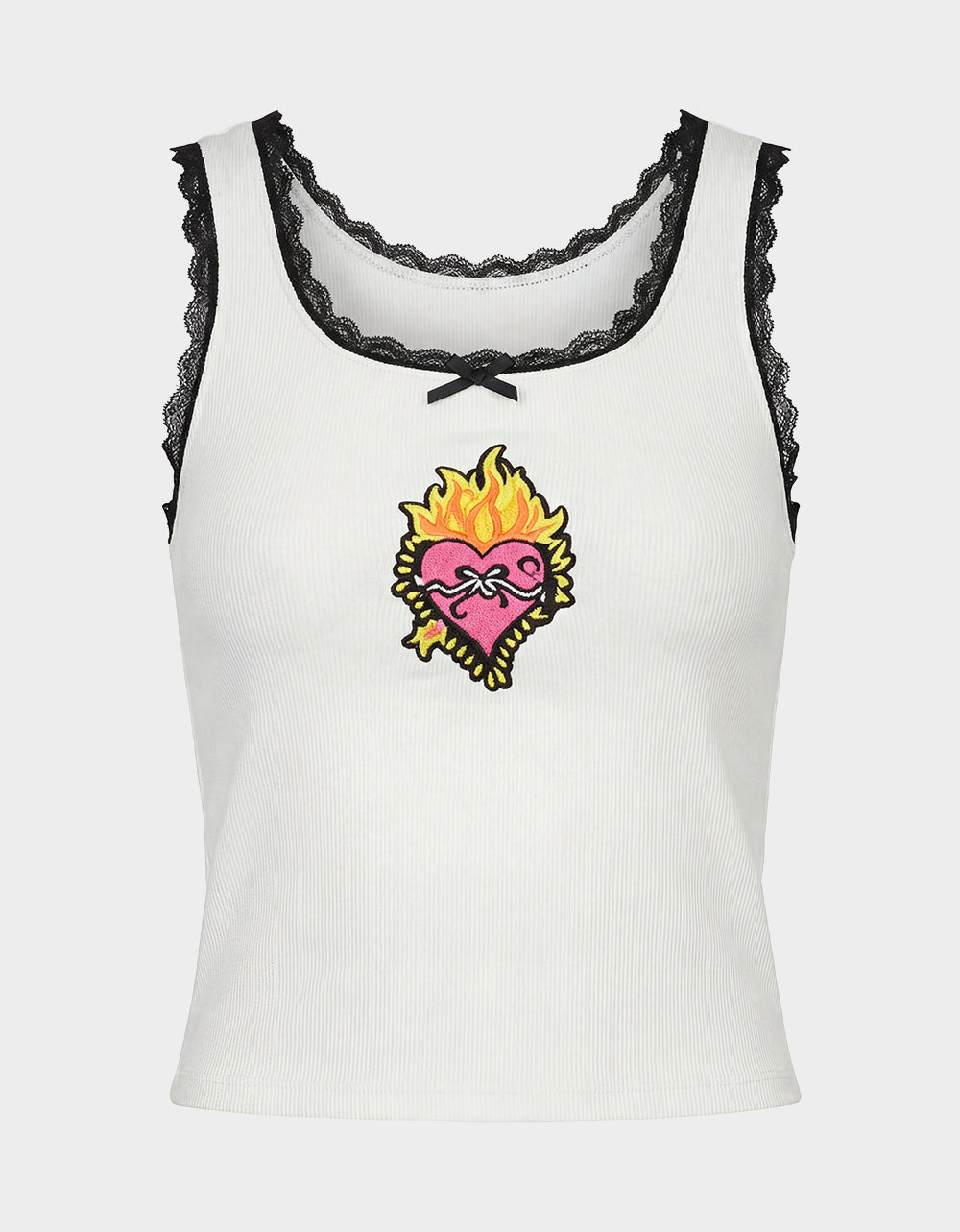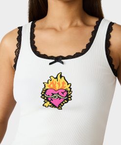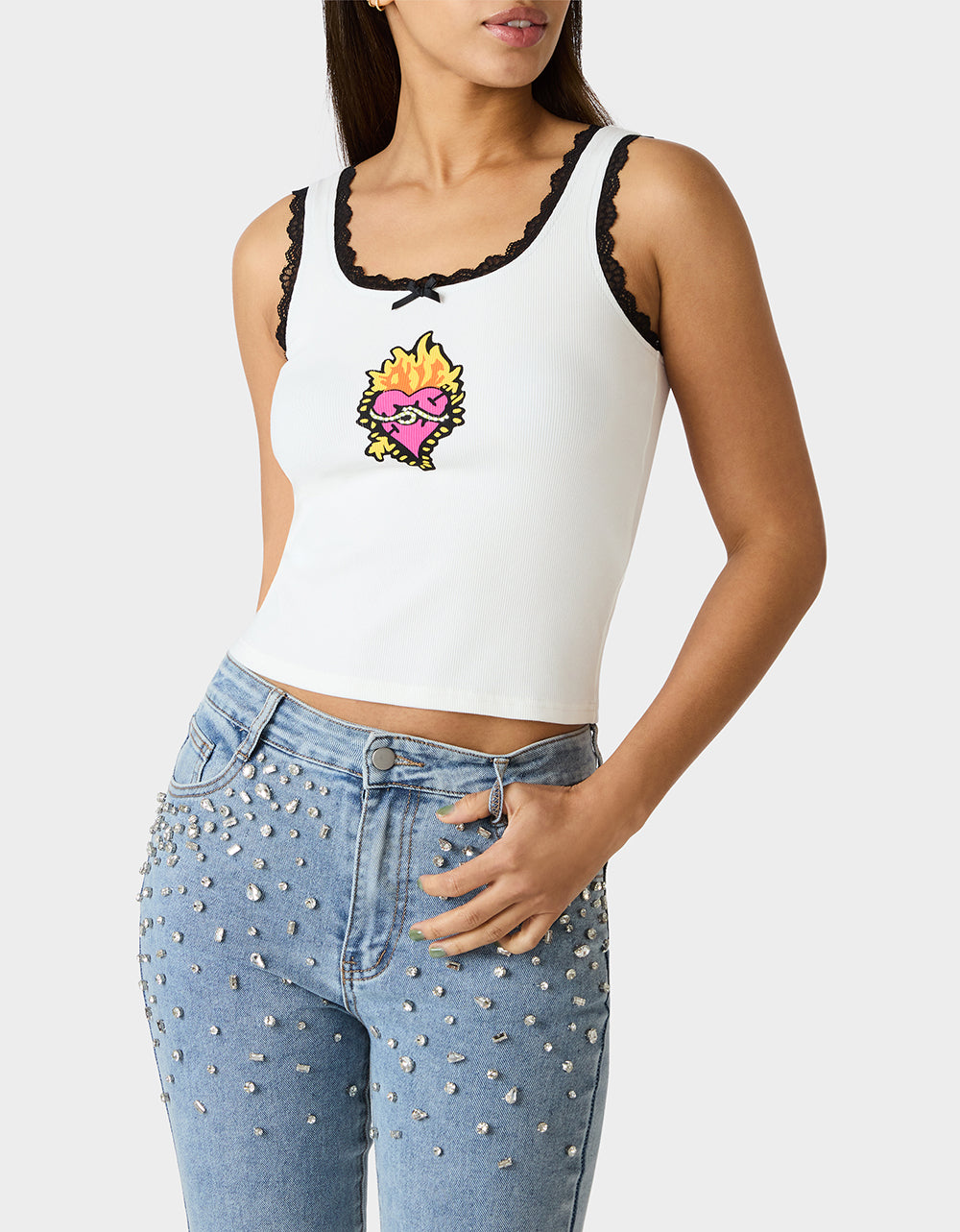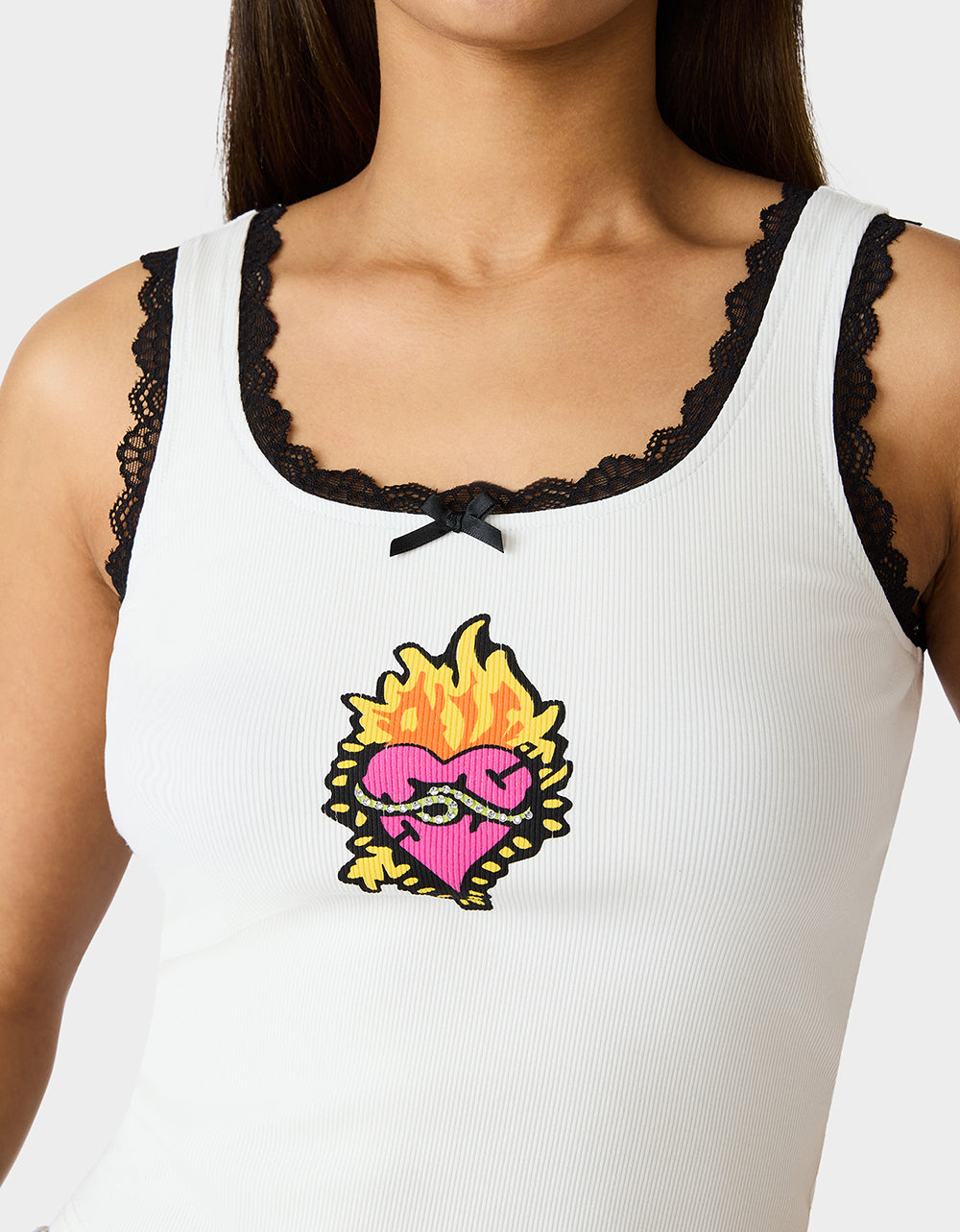 Ignite your style with the BETSEY ICON TANK TOP WHITE. a bold staple from our art campaign collection. This classic white tank features striking black lace trim detailing and a fiery heart graphic that makes a statement. Versatile enough for everyday wear yet distinctive enough to stand out. it’s the perfect piece to express your fearless spirit and add edge to any outfit.