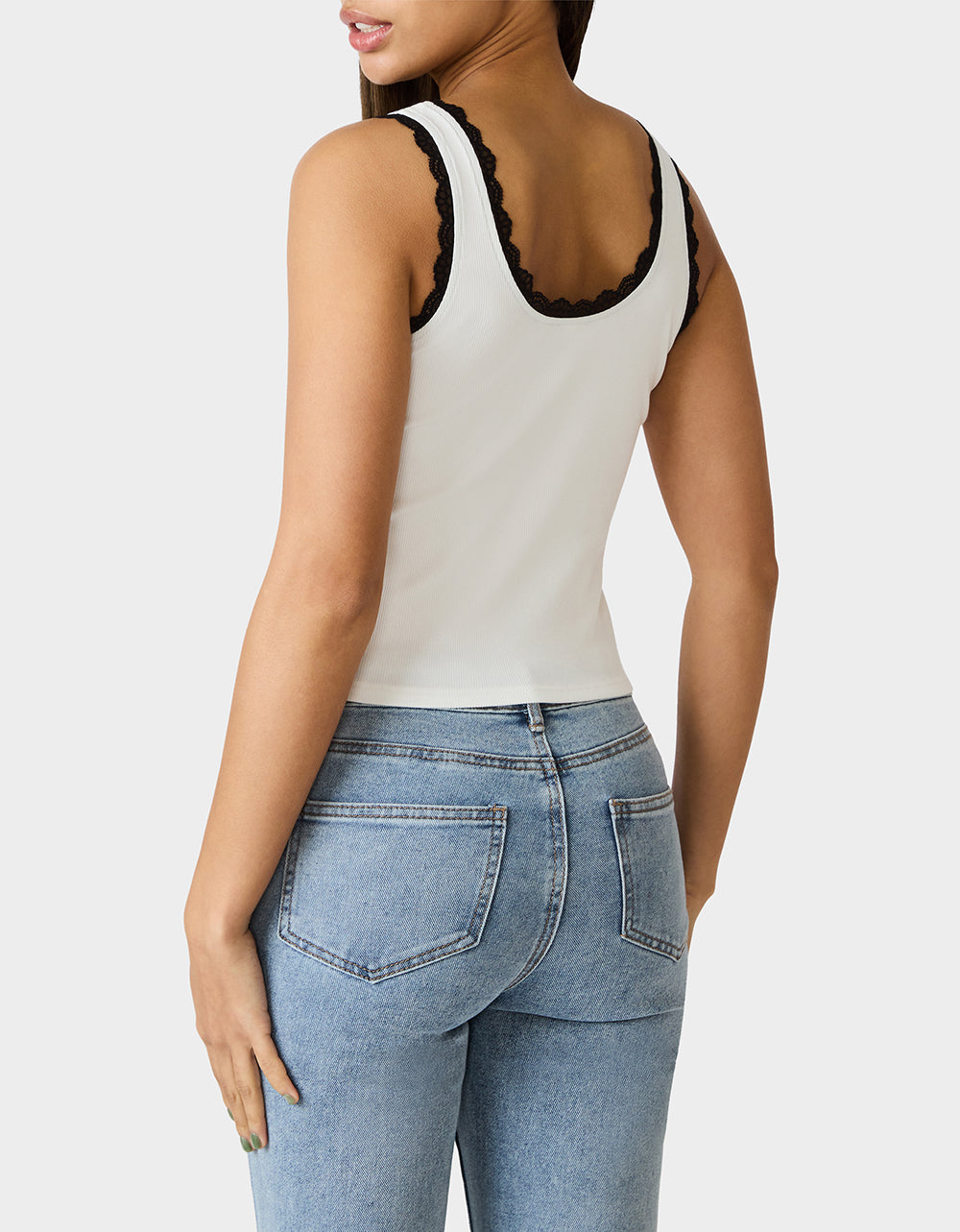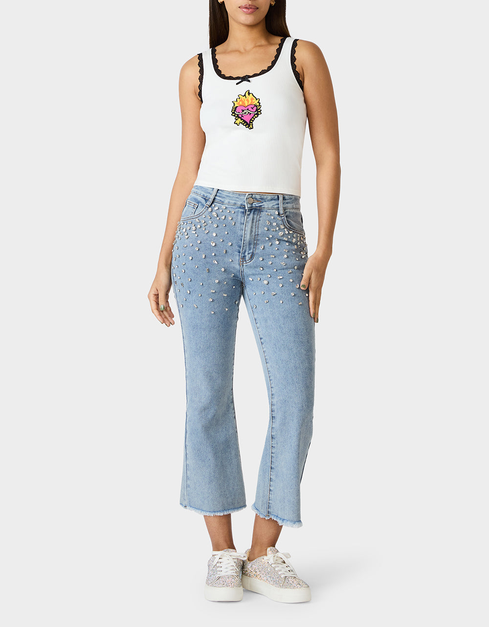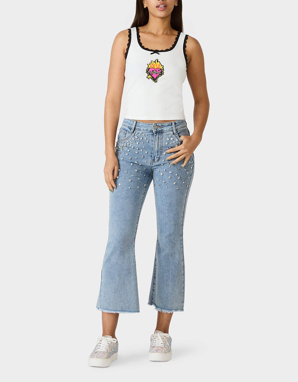 Ignite your style with the BETSEY ICON TANK TOP WHITE. a bold staple from our art campaign collection. This classic white tank features striking black lace trim detailing and a fiery heart graphic that makes a statement. Versatile enough for everyday wear yet distinctive enough to stand out. it’s the perfect piece to express your fearless spirit and add edge to any outfit.