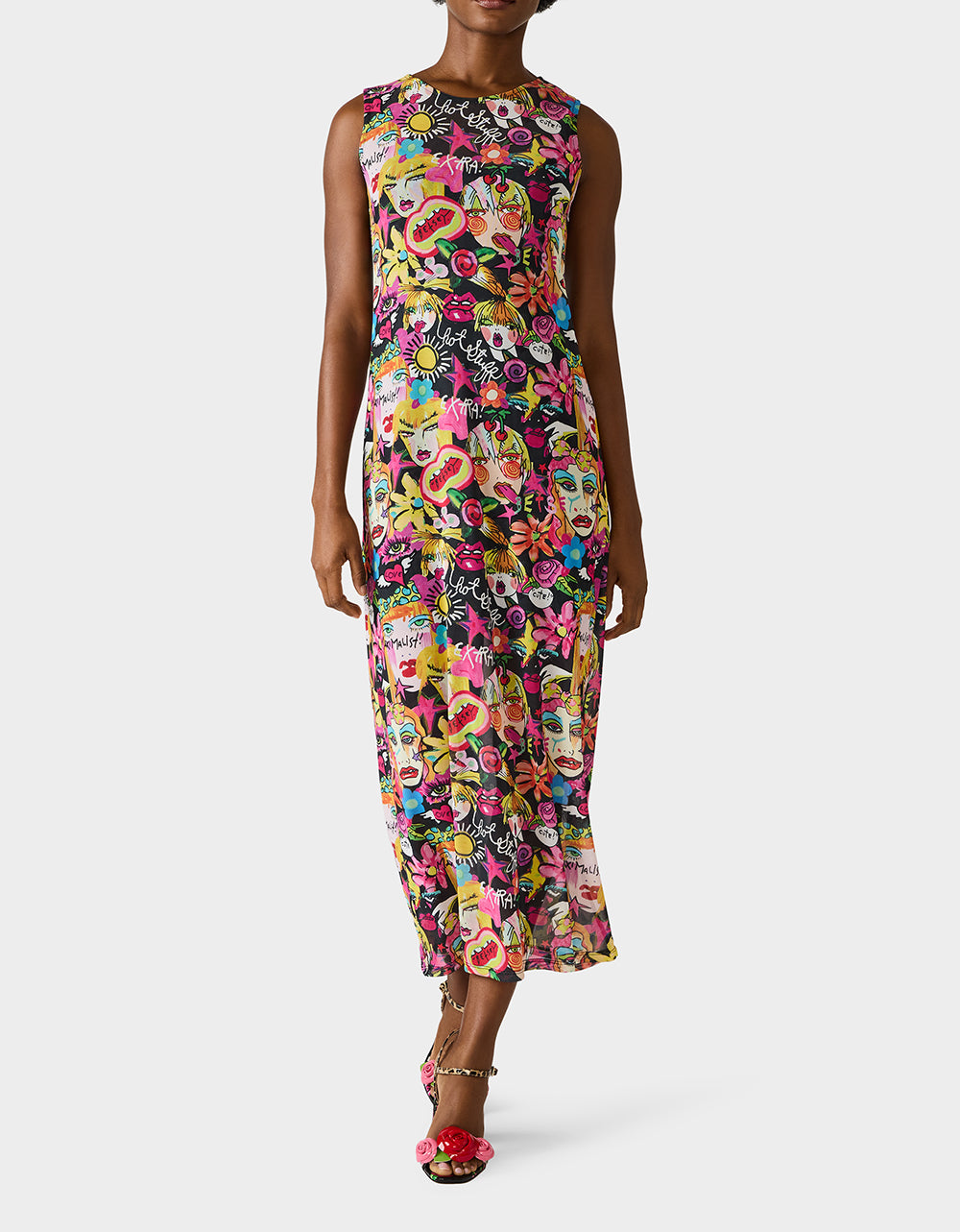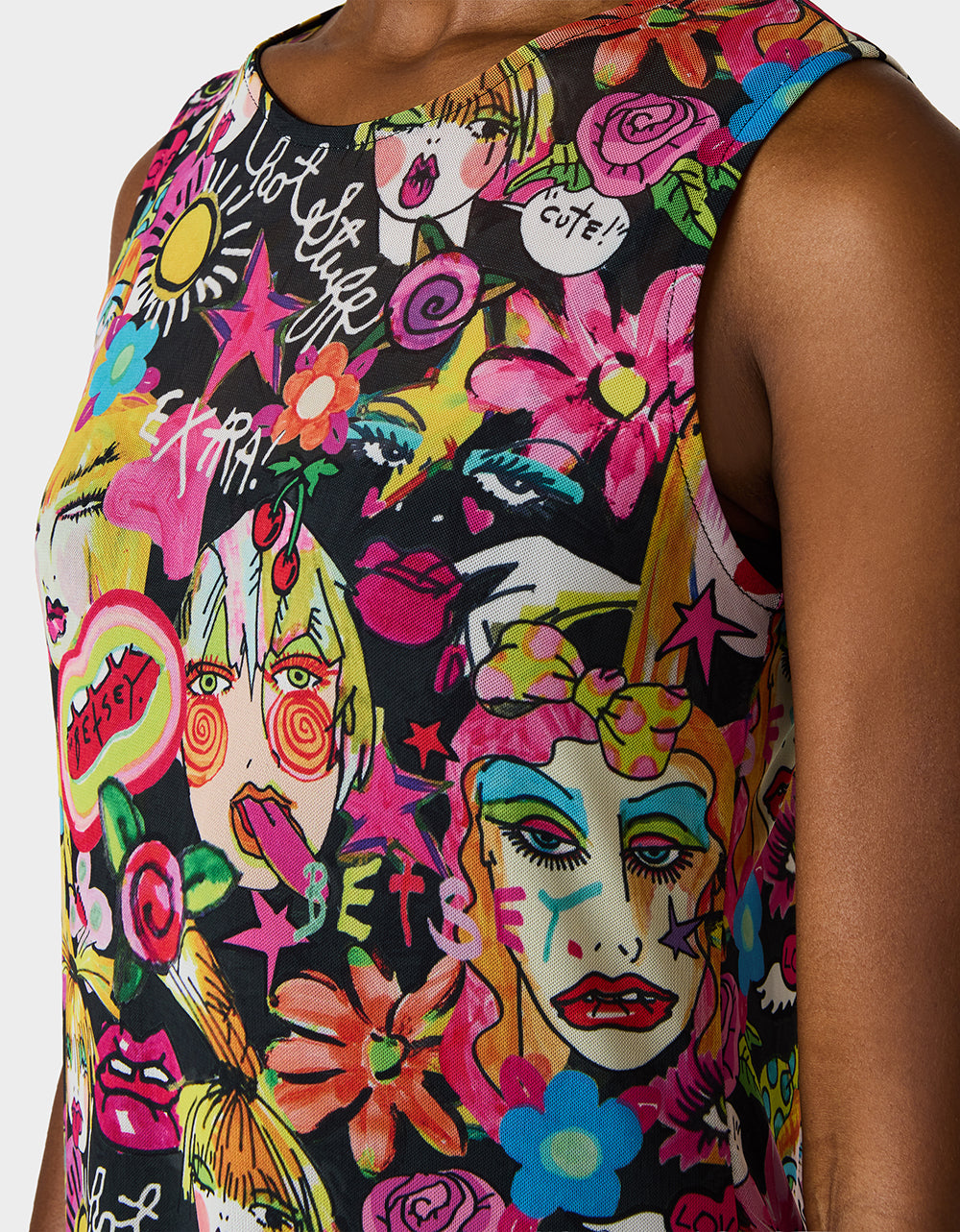 Make a bold impression with the BETSEY’S ART TANK DRESS BLACK MULTI. showcasing Betsey’s distinctive artistic design in her striking. multicolor hand-drawn print. Crafted from lightweight sheer fabric that moves gracefully with every step. it strikes the perfect balance between playful and polished. Style it layered for versatility or wear it solo for maximum impact. An instant classic that lets your personality shine through with confidence and flair.