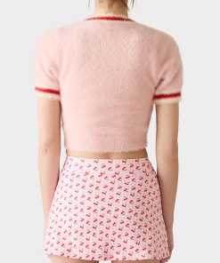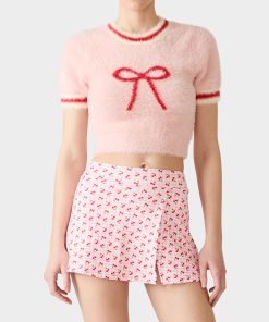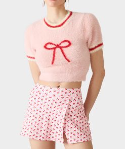 Make a statement with this cropped short sleeve top. the BETSEY’S BOW  PINK. The fitted silhouette flatters your frame while the charming bow detail adds a touch of whimsy and personality. Perfect for layering or wearing solo. this pink sweater is an instant wardrobe essential that brings fun to any outfit.