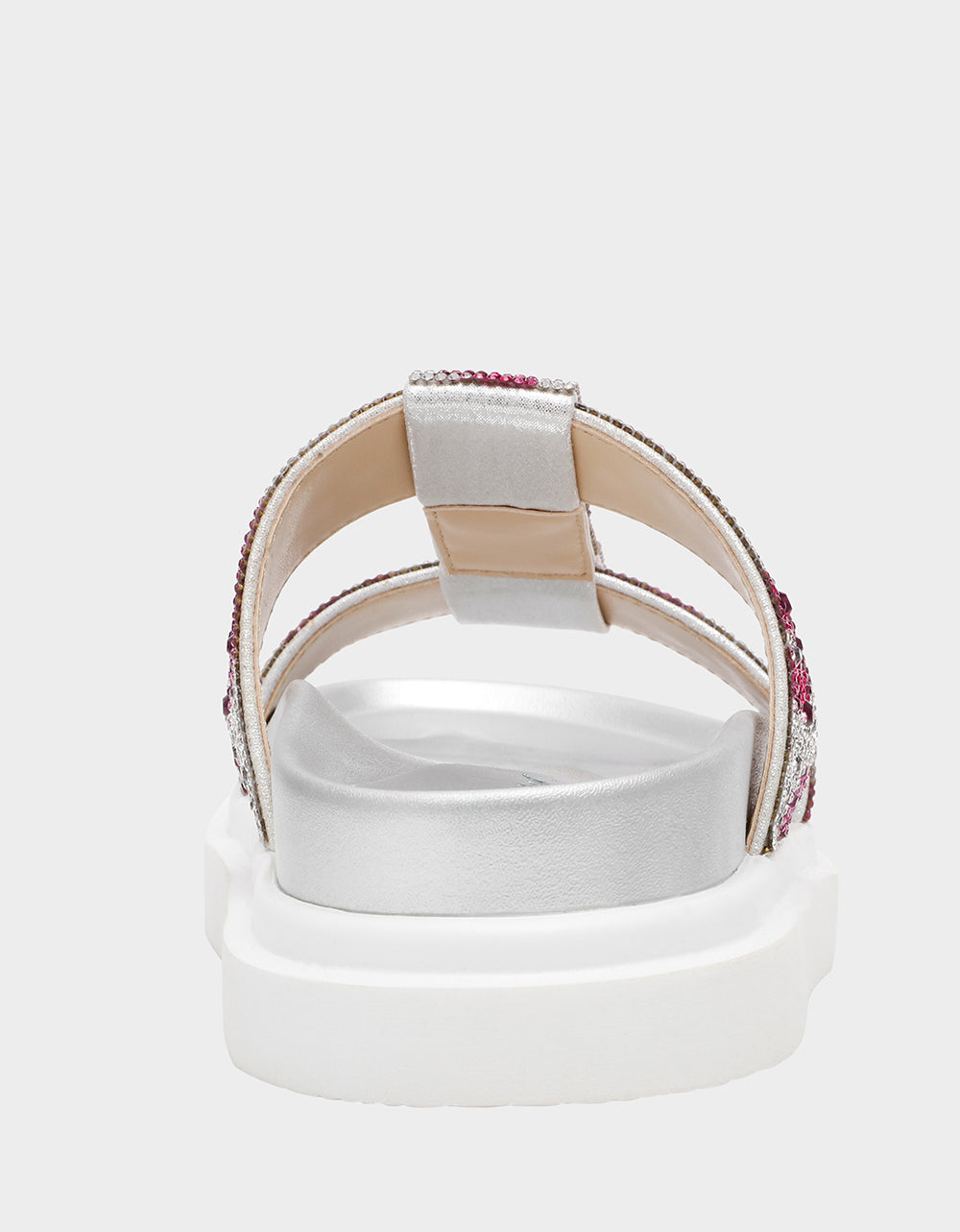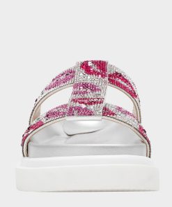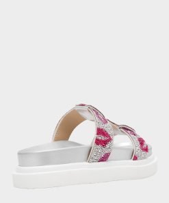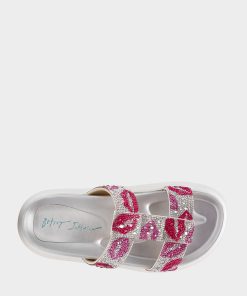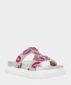 Step into playful charm with the BILLY MULTI LIPS footbed sandal. This easy slip-on style dazzles with sparkling rhinestones and a fun red and pink lip print that adds a pop of personality to any outfit. Perfect for those who love a little sparkle and a lot of fun. these sandals bring a vibrant twist to your casual look. Prints really do make everything more exciting!