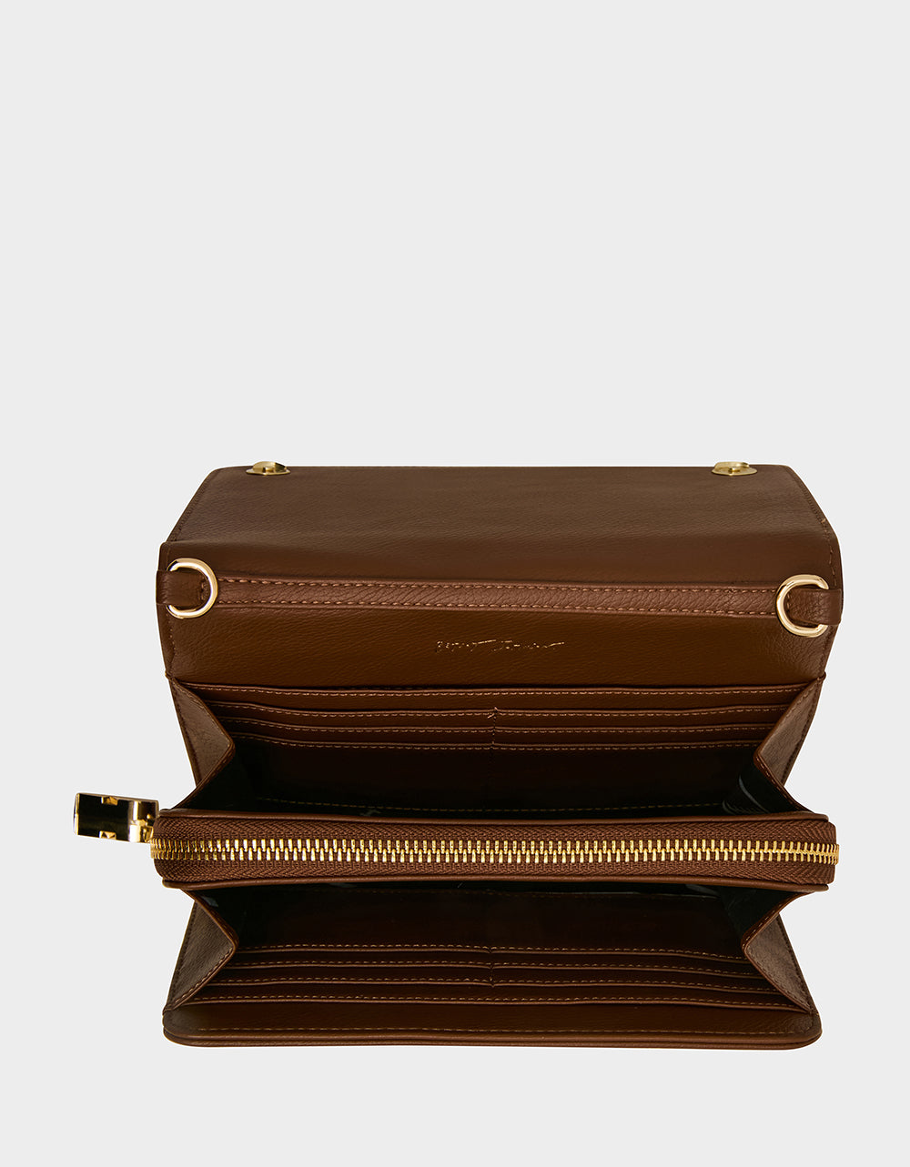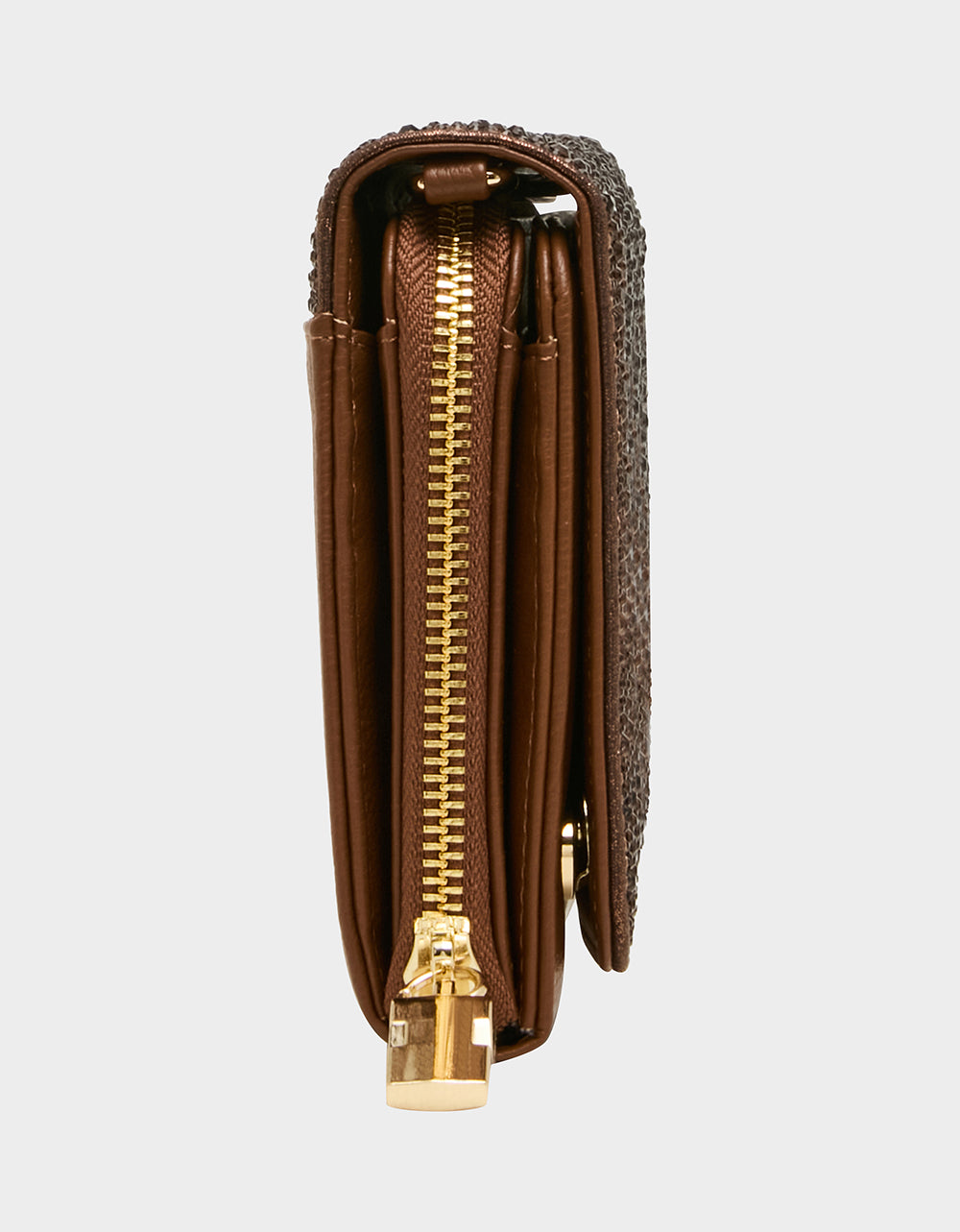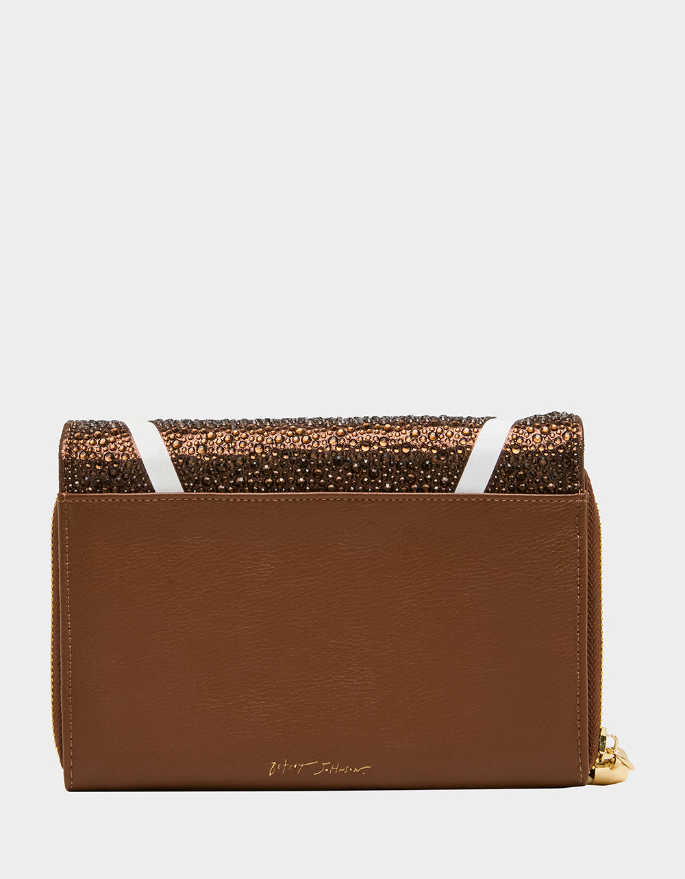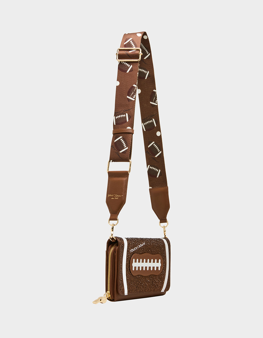 Elevate your game day style with the BLITZ & GLITZ ON CHAIN BROWN. This wallet features eye-catching rhinestone embellishments that catch the light with every move. The standout football detail strap adds a sporty edge perfect for fans who love to show their team spirit. Whether you’re heading to the stadium or out on the town. this sports-themed accessory combines glamour with functionality for the ultimate statement piece.