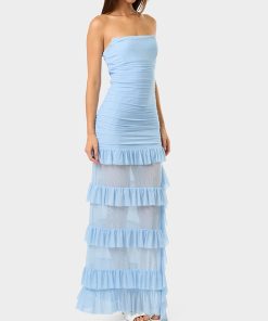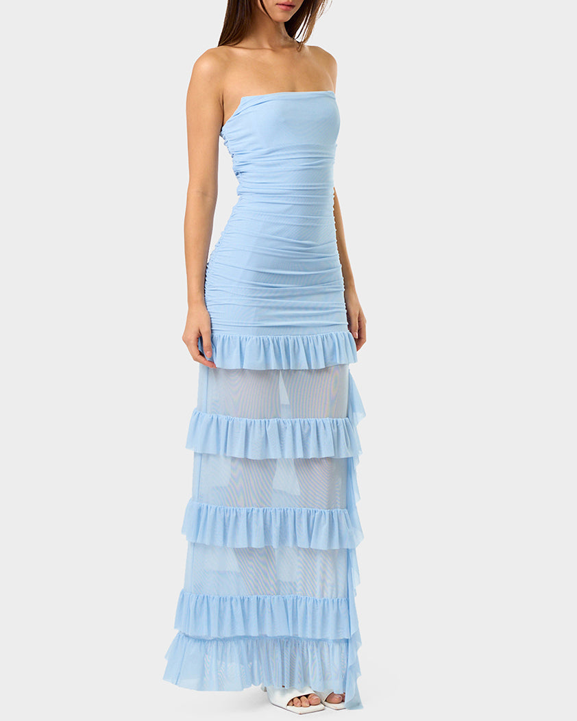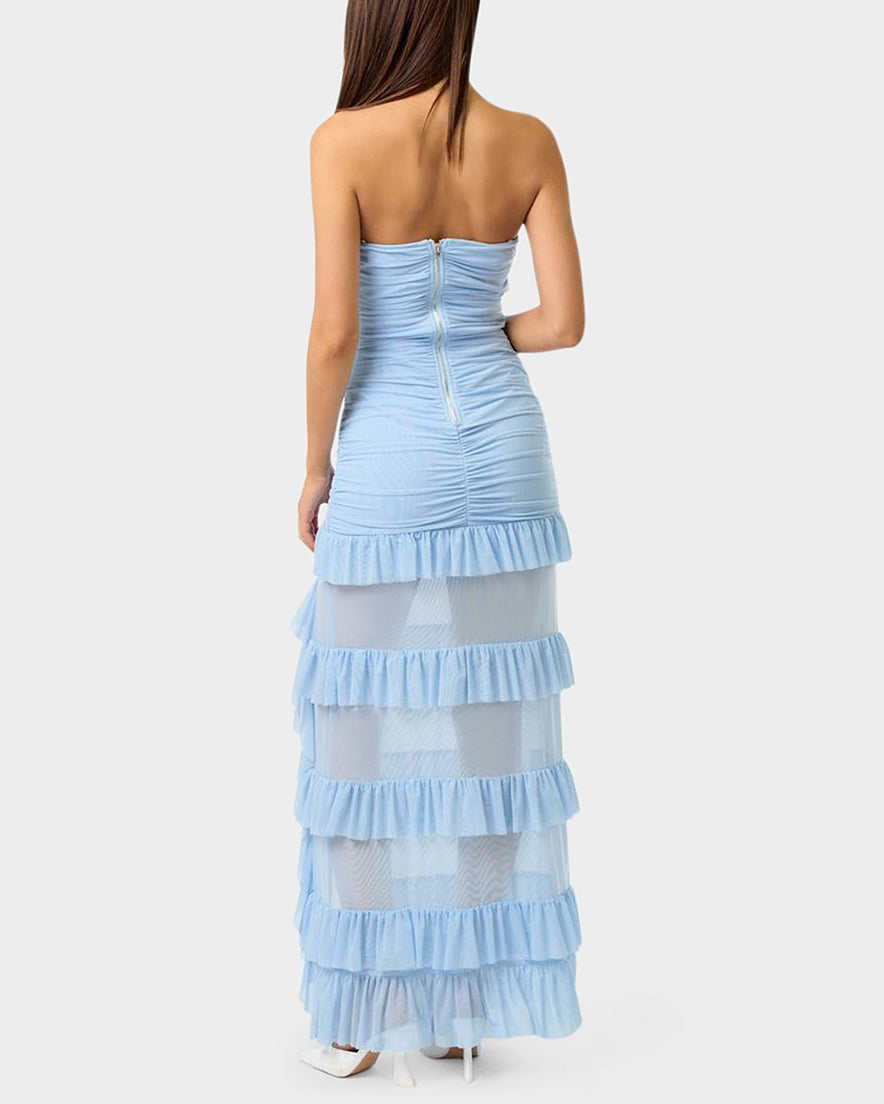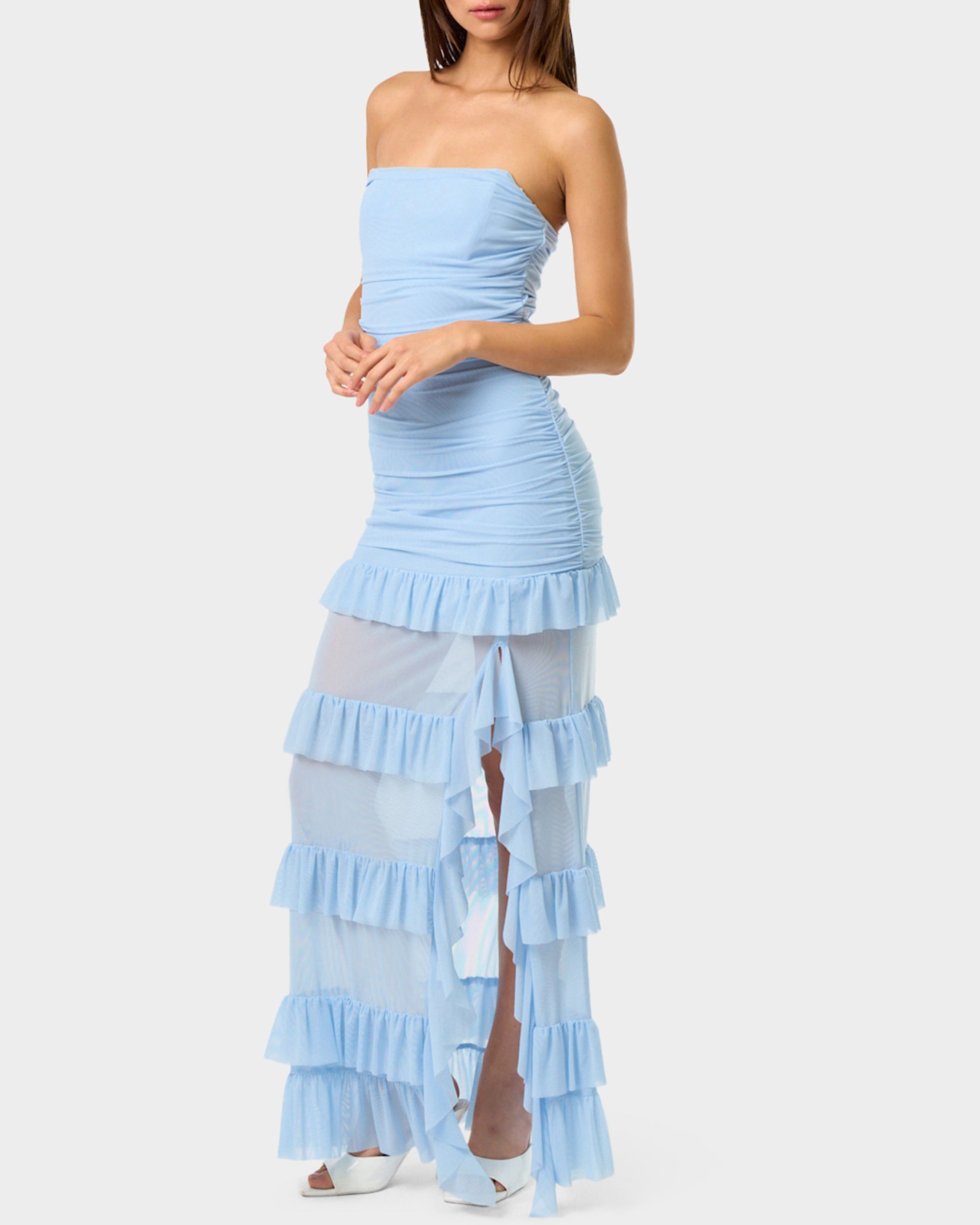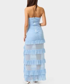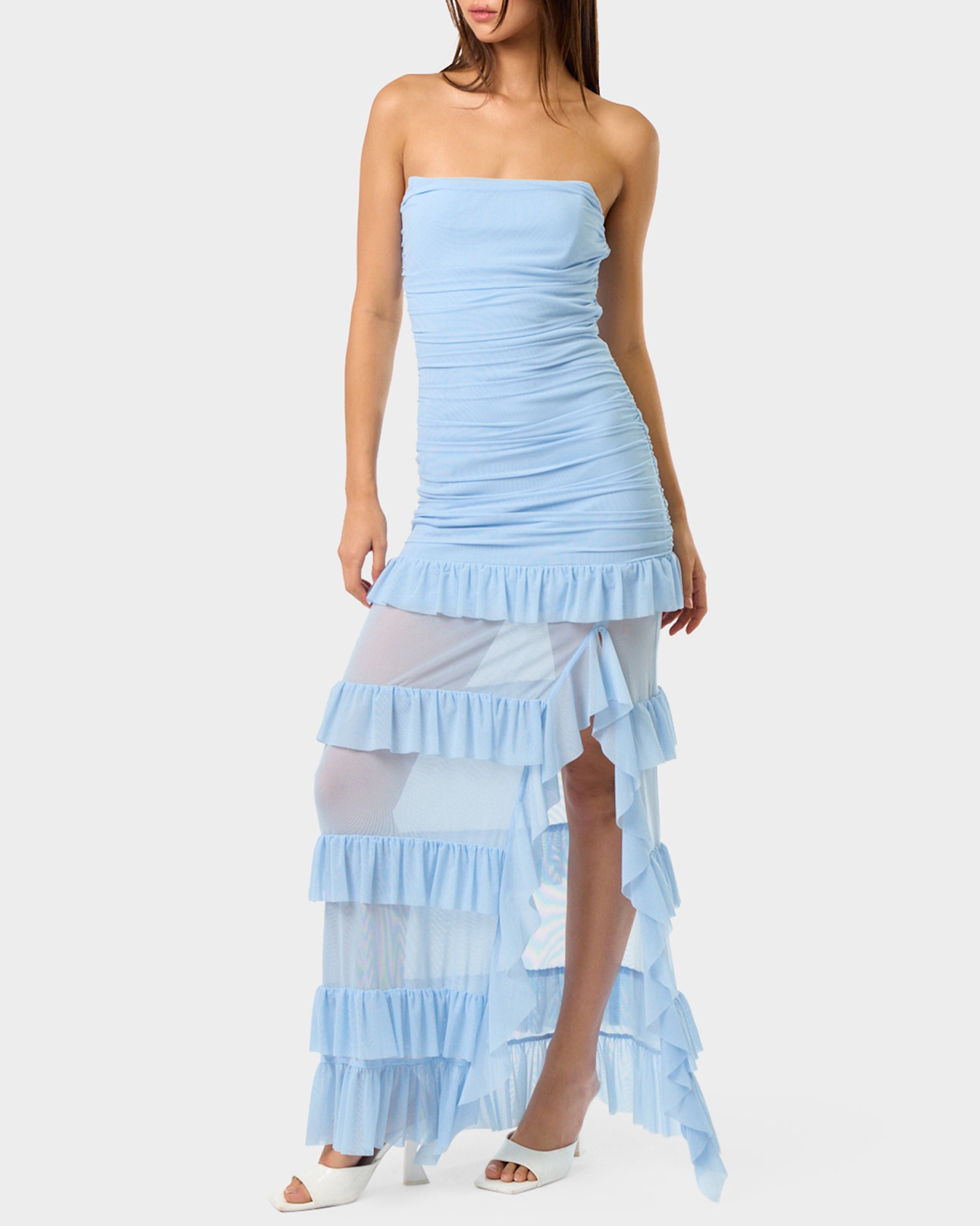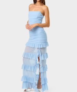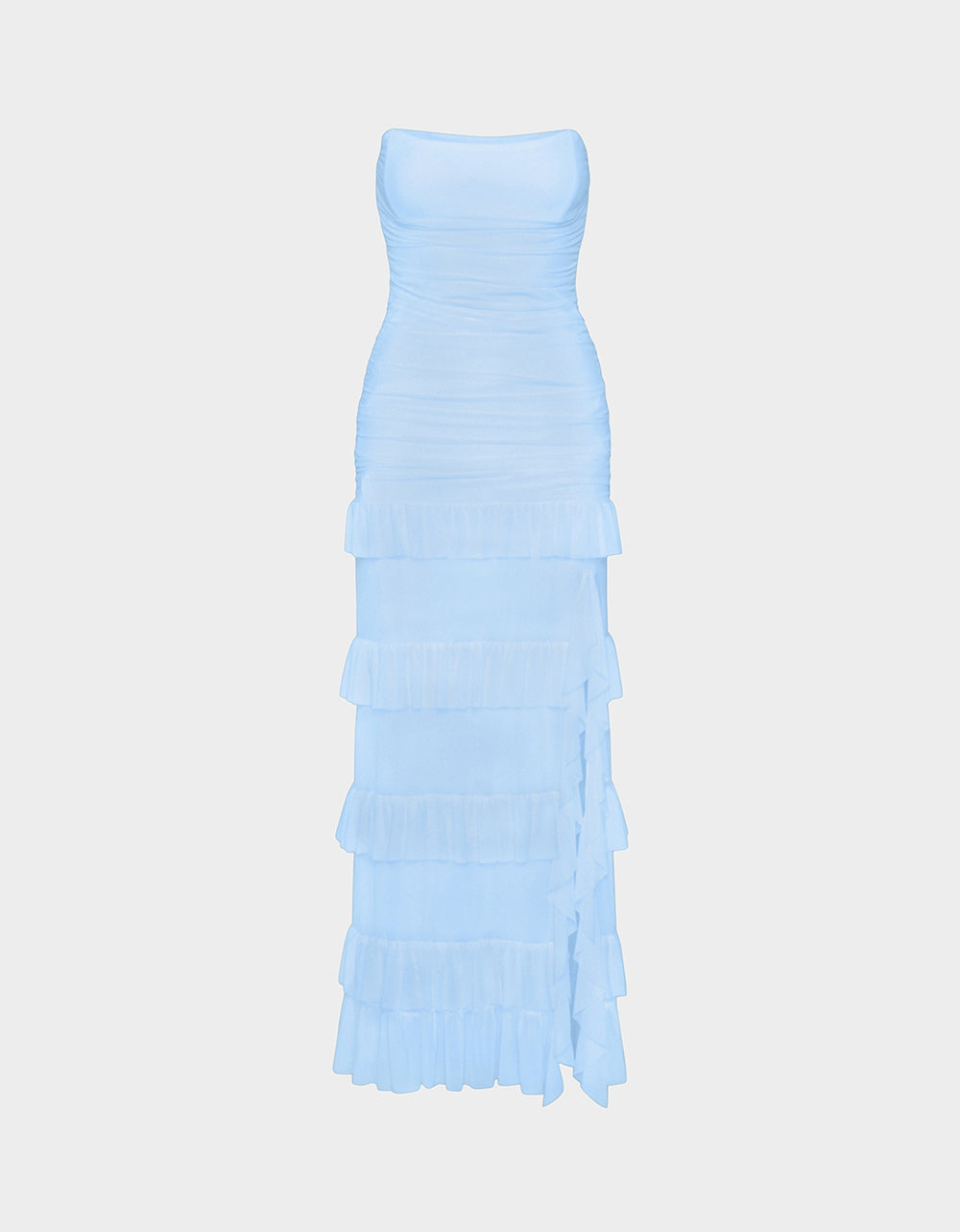 Turn heads in our strapless maxi dress that’s equal parts elegance and edge. The sheer leg panels feature playful ruffle detailing that adds movement and flirtation to every step. Whether you’re hitting the dance floor at a party or soaking up sun on vacation. this light blue stunner delivers that perfect balance of sophisticated and fun. Slip it on and let the good times roll.