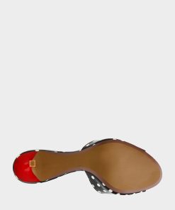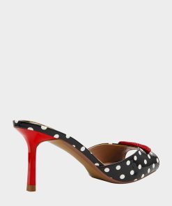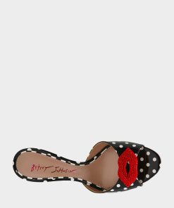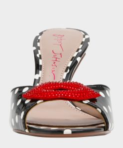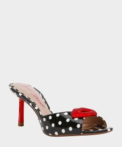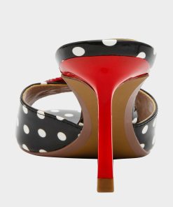 Step out in style with the CASIDY WHITE BLACK POLKA DOT mules. featuring a fun polka dot print and a dazzling large rhinestone lip. These bold heels slip on easily and instantly add a playful sparkle to any outfit. perfect for turning heads wherever you go.