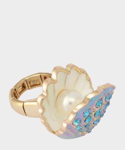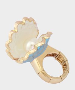 Make a splash with this sea life inspired cocktail featuring dreamy blue tonal clam shell adorned with coordinating stones and playful pearl inside. Ring is size 7 with an easy stretch closure. Made from metal. enamel and imitation pearl.