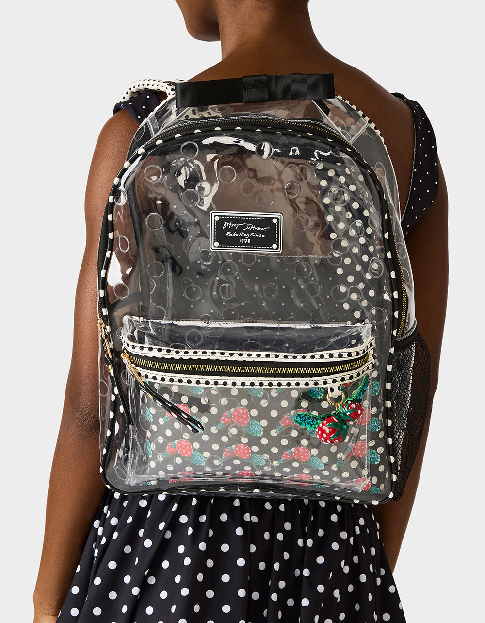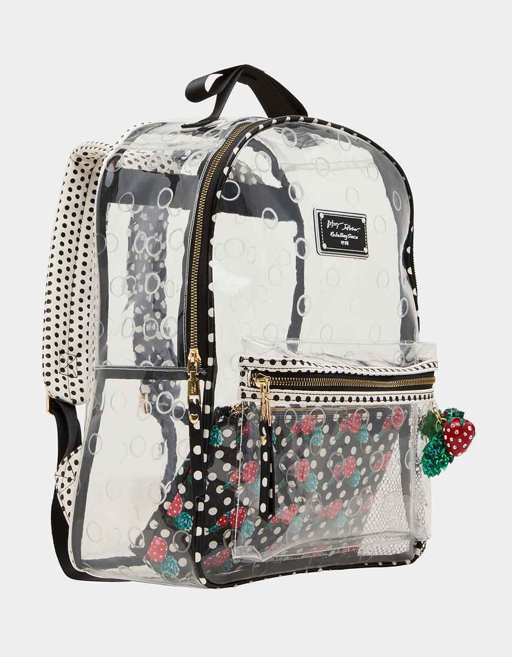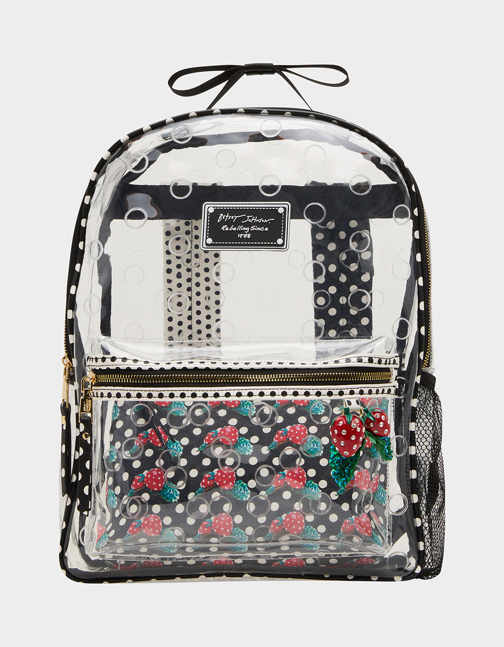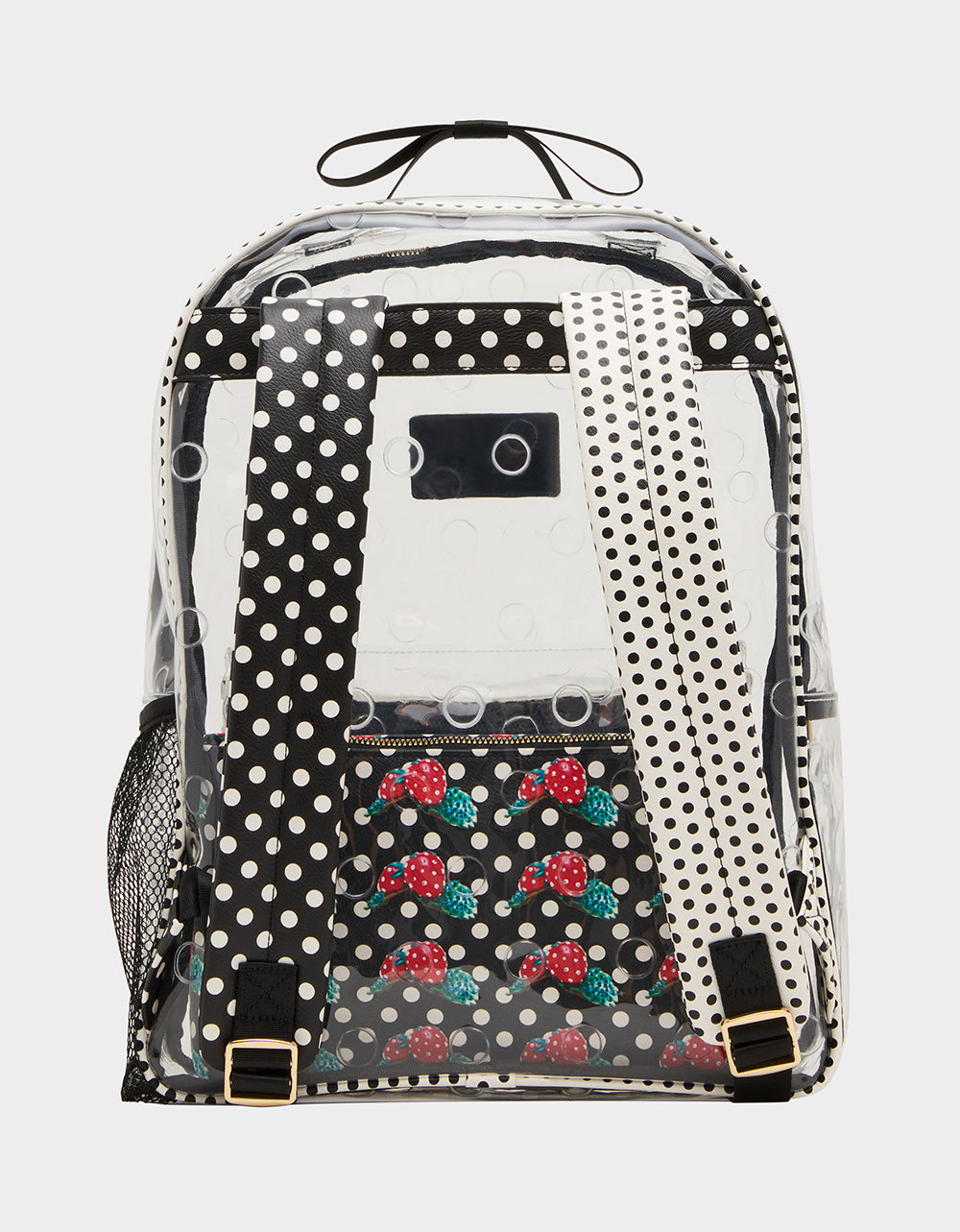 CLEAR BACKPACK DOTS is your back-to-school essential that keeps everything visible and organized. The transparent design lets you spot exactly what you need in seconds—no more digging through dark pockets. A hidden internal pouch keeps personal items private while playful dots and strawberries add a fun pop of personality to your everyday carry. Perfect for students. teachers. commuters. and anyone who values both style and functionality.