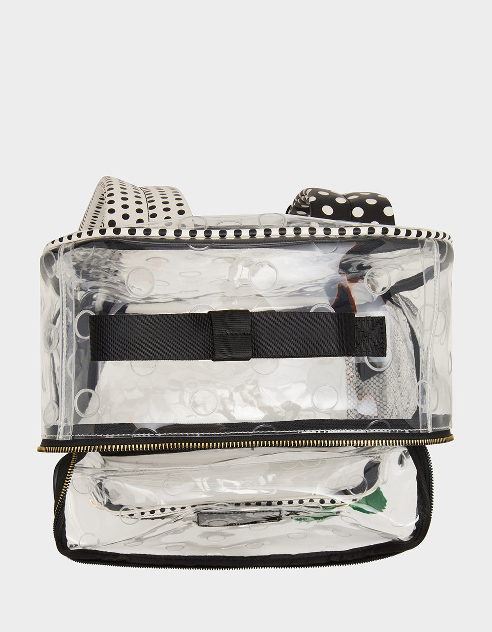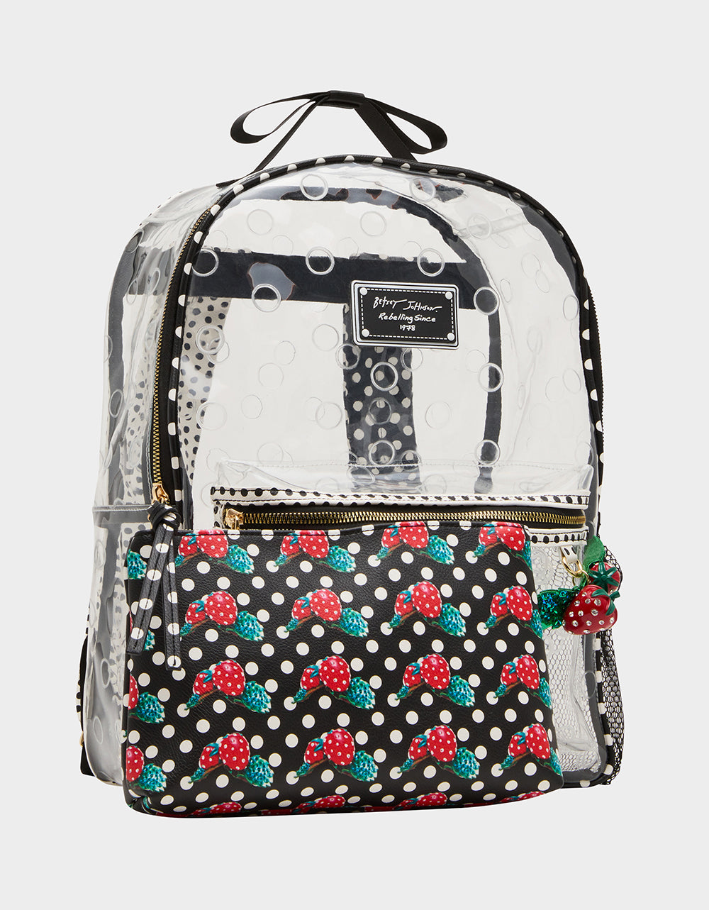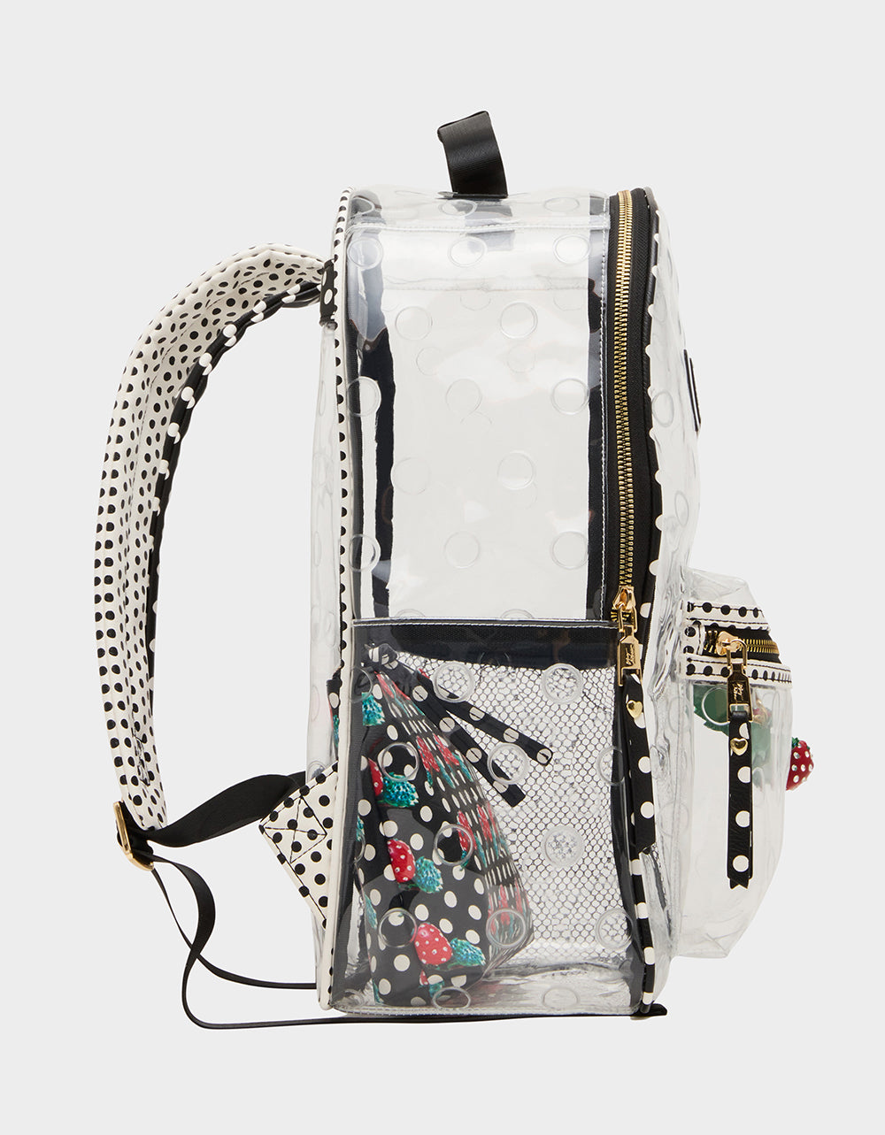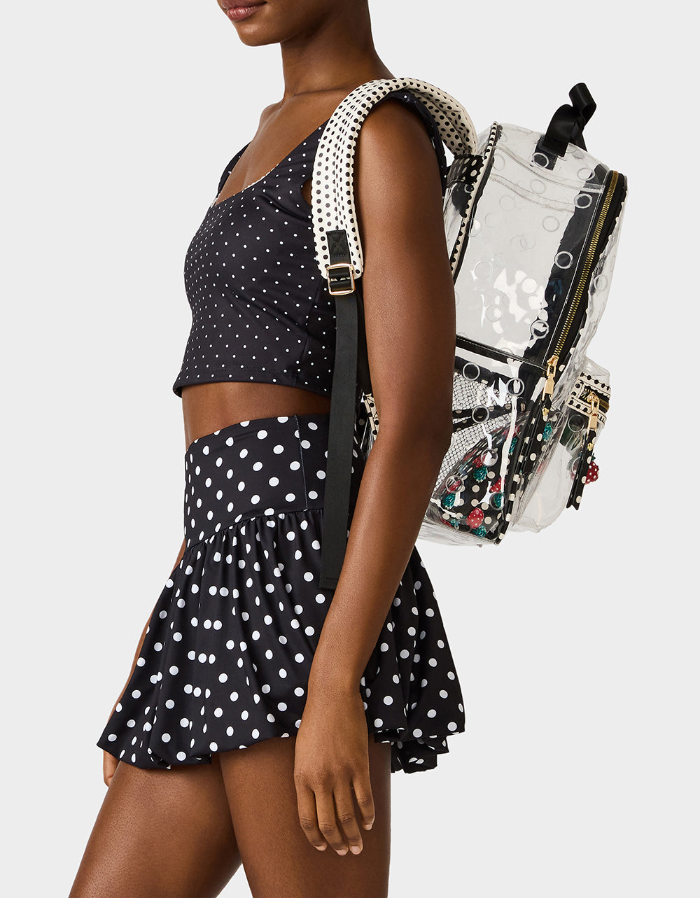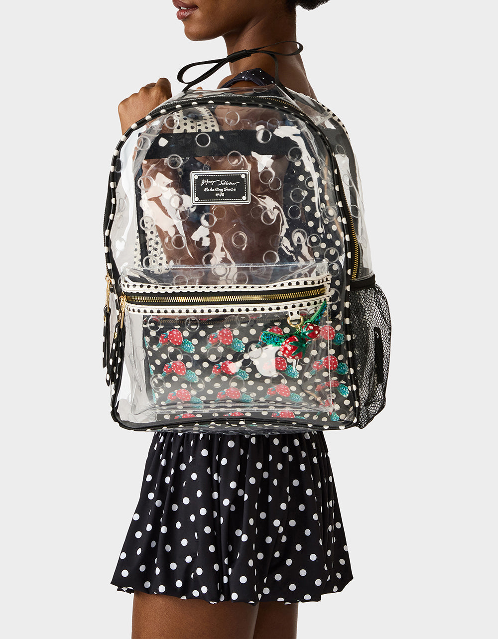 CLEAR BACKPACK DOTS is your back-to-school essential that keeps everything visible and organized. The transparent design lets you spot exactly what you need in seconds—no more digging through dark pockets. A hidden internal pouch keeps personal items private while playful dots and strawberries add a fun pop of personality to your everyday carry. Perfect for students. teachers. commuters. and anyone who values both style and functionality.